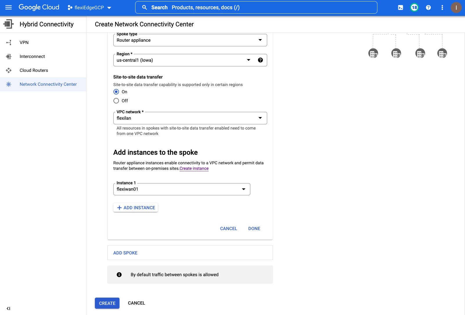 Follow this guide to sucessfully deploy flexiWAN on GCP with its Network Connectivity Center. To find out more about Google Network Connectivity Center click here. Documentation is structured so it follows GCP deployment flow, covering initial VM instance configuration and flexiWAN deployment. After sucessfully completing flexiWAN deployment, follow the guide to configure BGP peering in GCP and flexiWAN.