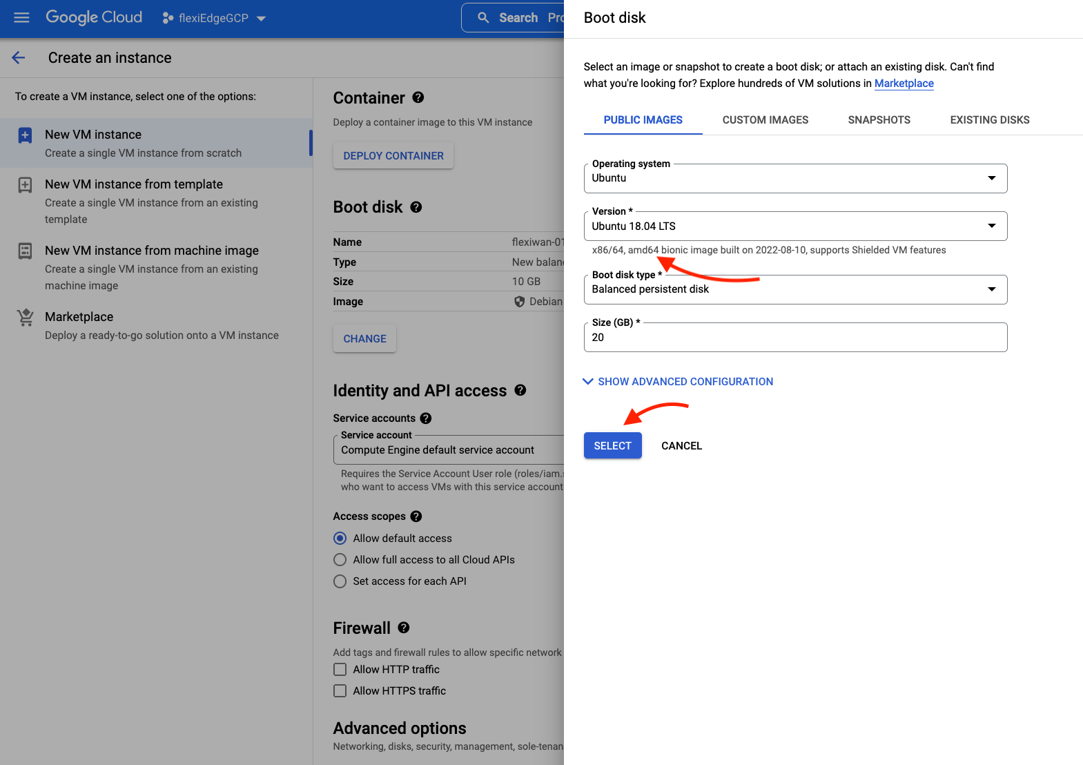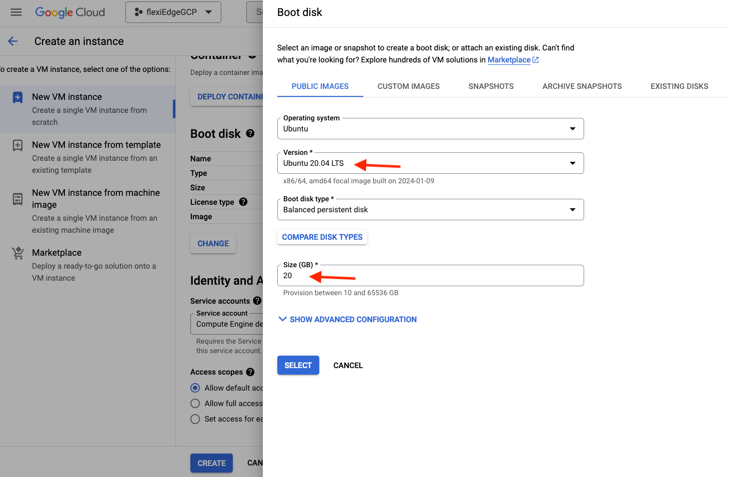 In the Boot disk section select Ubuntu as a OS and 20.04 LTS x86/64 version. Make sure to select AMD64 one and not ARM. Enter 20GB for the disk size and click on Select to close the screen.