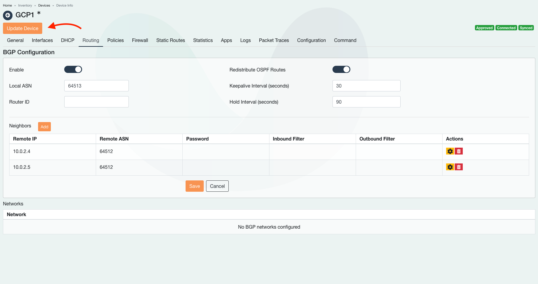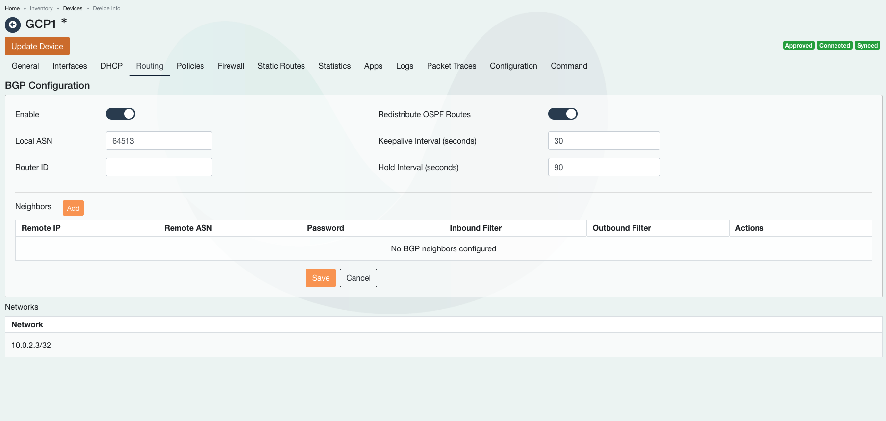 Confirm both remote IP’s under Neighbors match the GCP peers as well as remote ASN. Click Save.