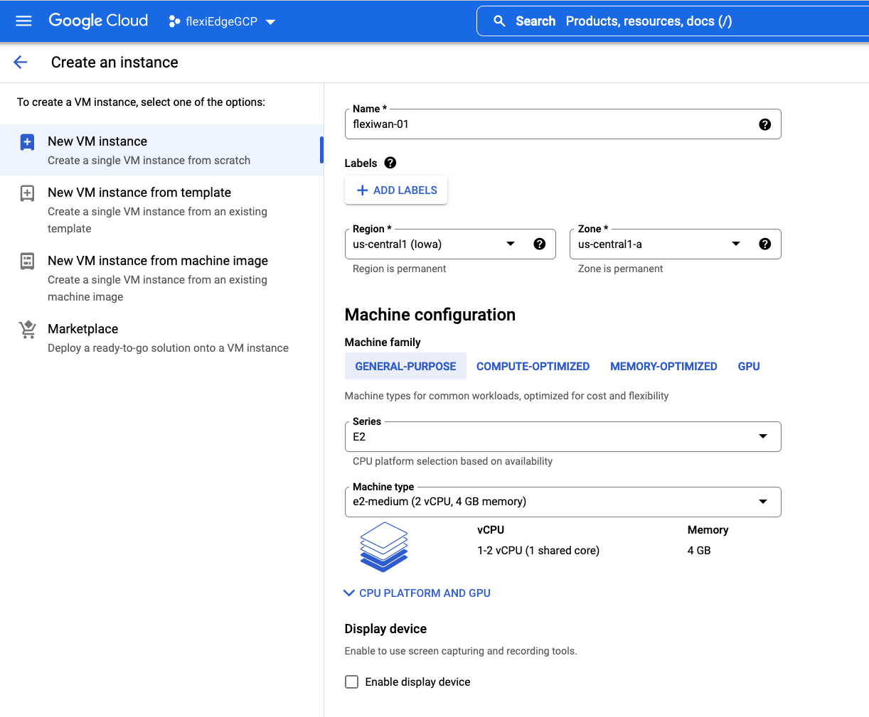Name the instance, pick appropriate region and under the Machine configuration select E2-medium machine which has 2 vCPU’s and 4GB of RAM.