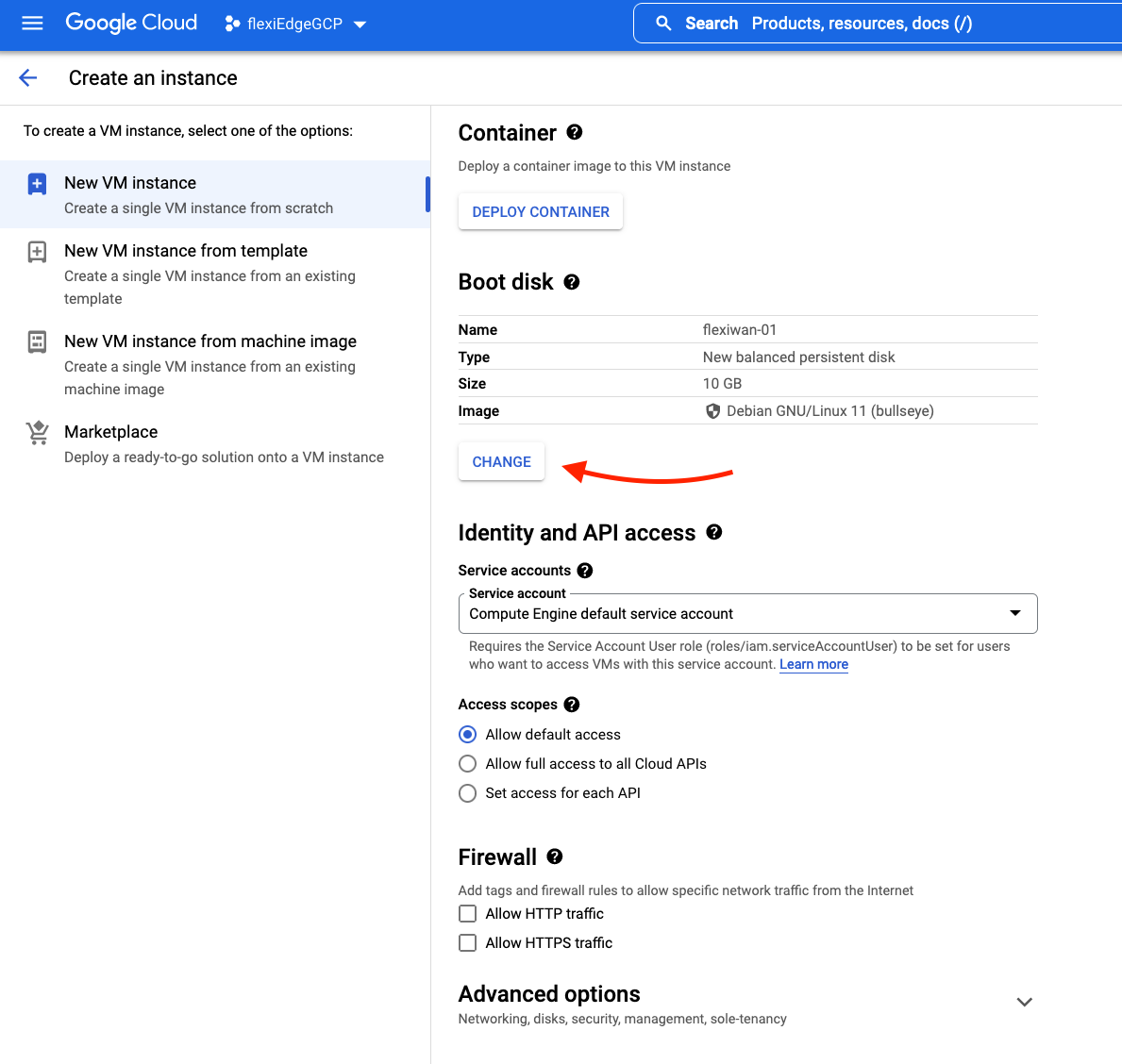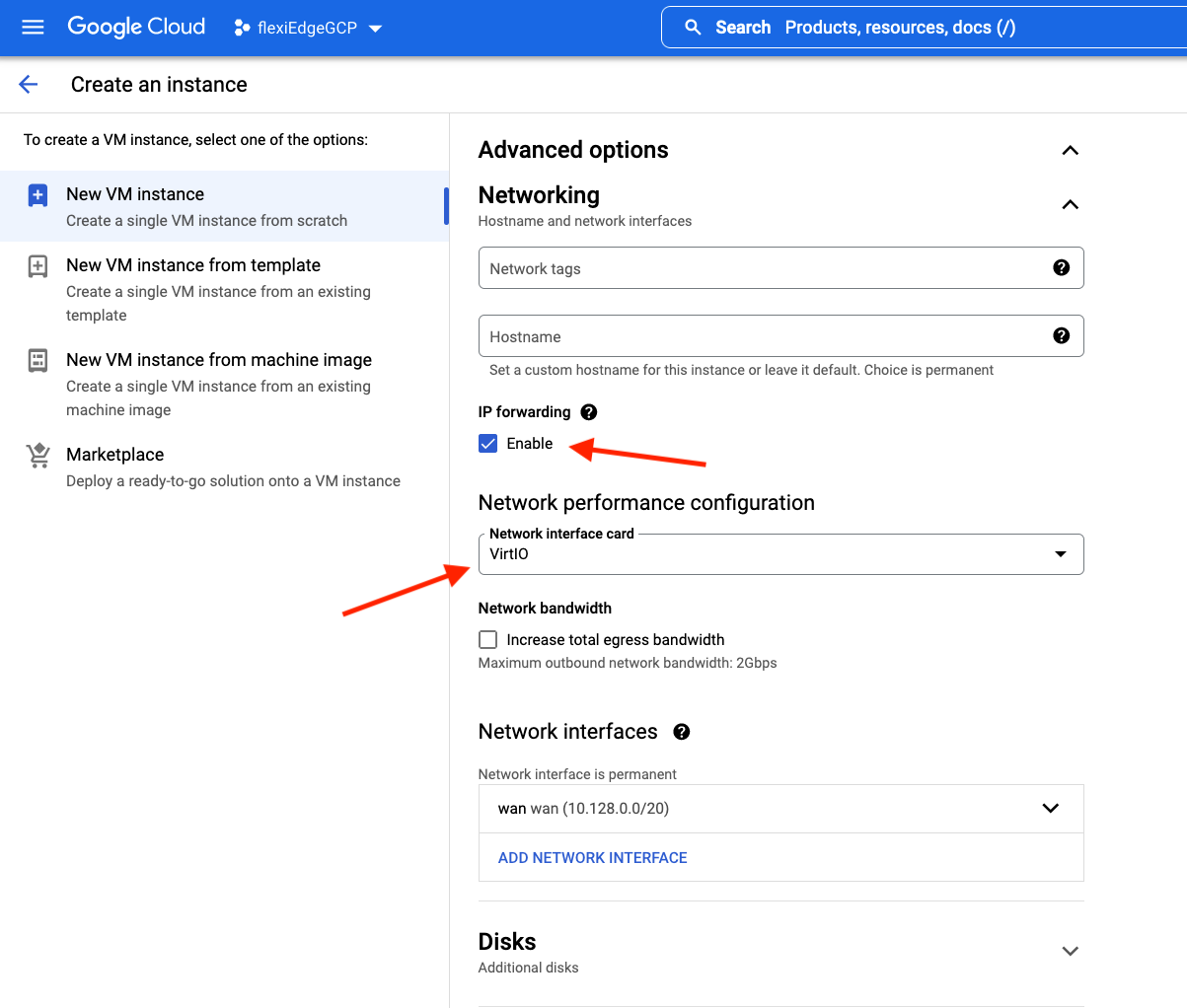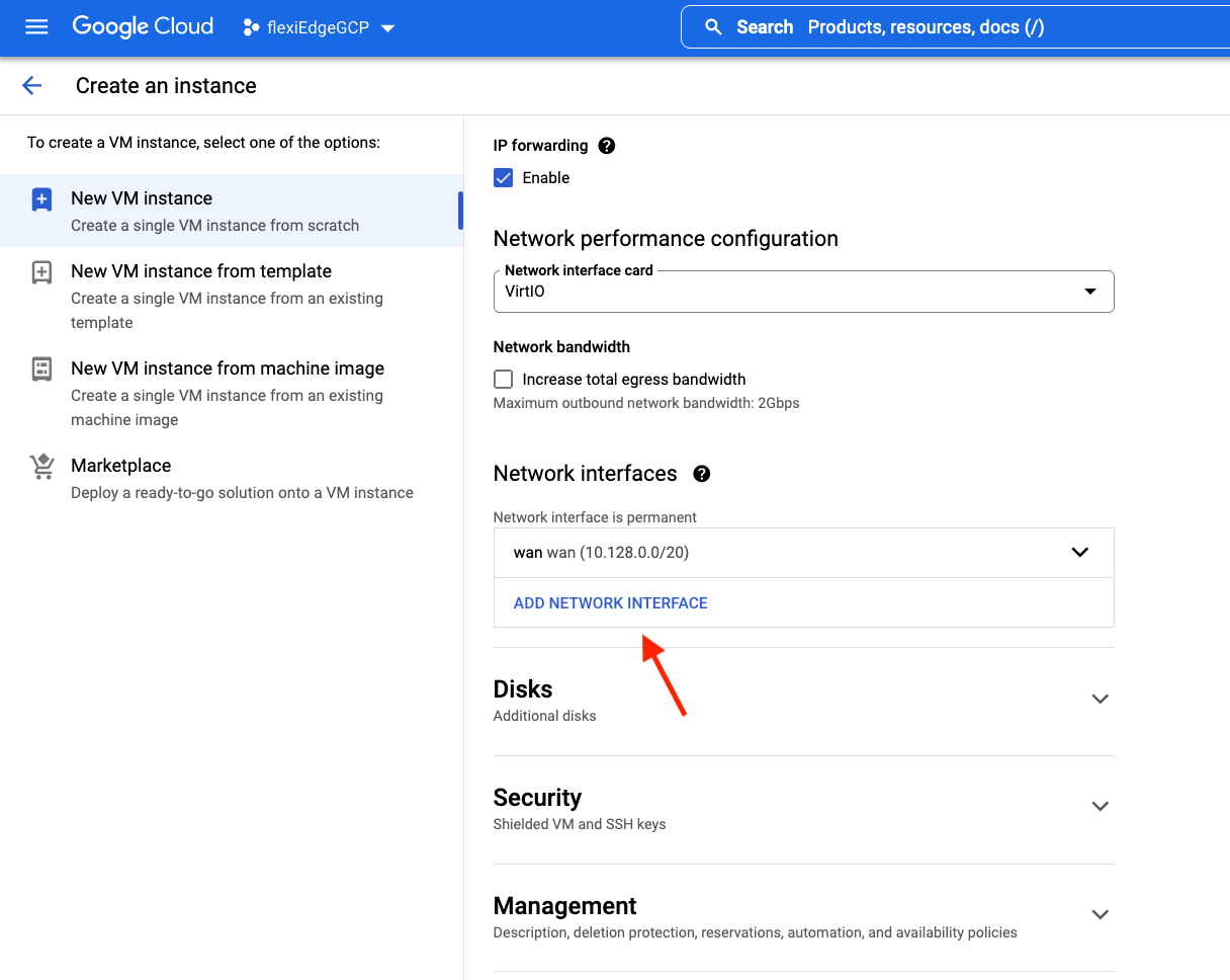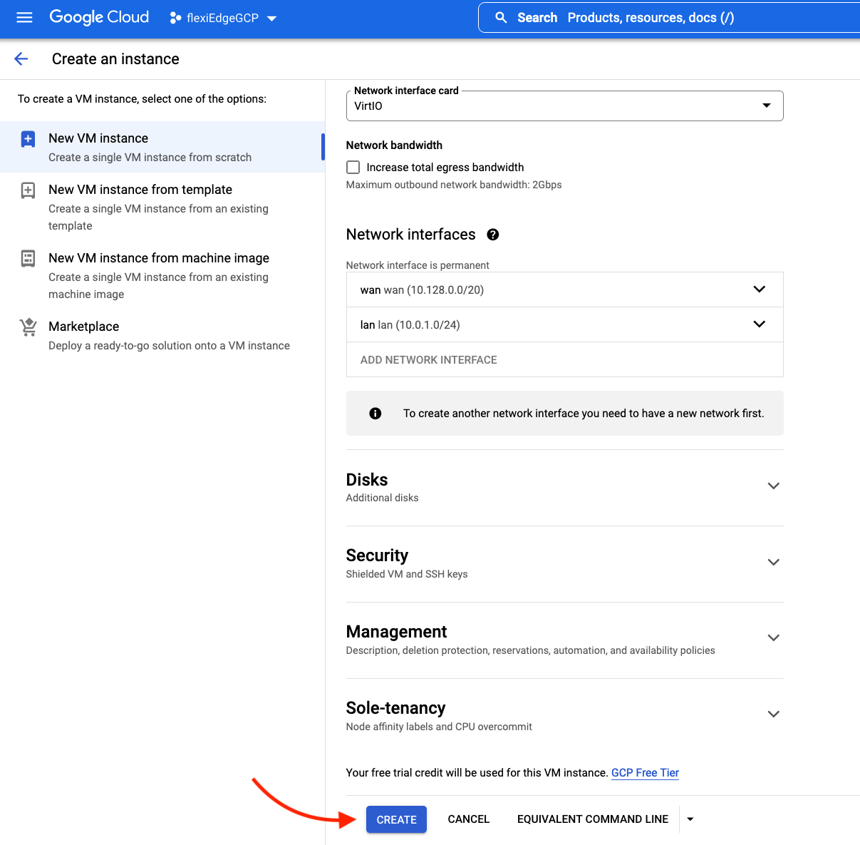 gcloud compute instances create flexiwan-01 --project=flexiedgetest --zone=us-central1-a --machine-type=e2-medium --network-interface=network-tier=PREMIUM,nic-type=VIRTIO_NET,subnet=wan --network-interface=nic-type=VIRTIO_NET,subnet=lan,no-address --can-ip-forward --maintenance-policy=MIGRATE --provisioning-model=STANDARD --service-account=626012385667[email protected] --scopes=https://www.googleapis.com/auth/devstorage.read_only,https://www.googleapis.com/auth/logging.write,https://www.googleapis.com/auth/monitoring.write,https://www.googleapis.com/auth/servicecontrol,https://www.googleapis.com/auth/service.management.readonly,https://www.googleapis.com/auth/trace.append --create-disk=auto-delete=yes,boot=yes,device-name=flexiwan-01,image=projects/ubuntu-os-cloud/global/images/ubuntu-2004-focal-v20231130,mode=rw,size=20,type=projects/flexiedgetest/zones/us-central1-a/diskTypes/pd-balanced --no-shielded-secure-boot --shielded-vtpm --shielded-integrity-monitoring --reservation-affinity=any
