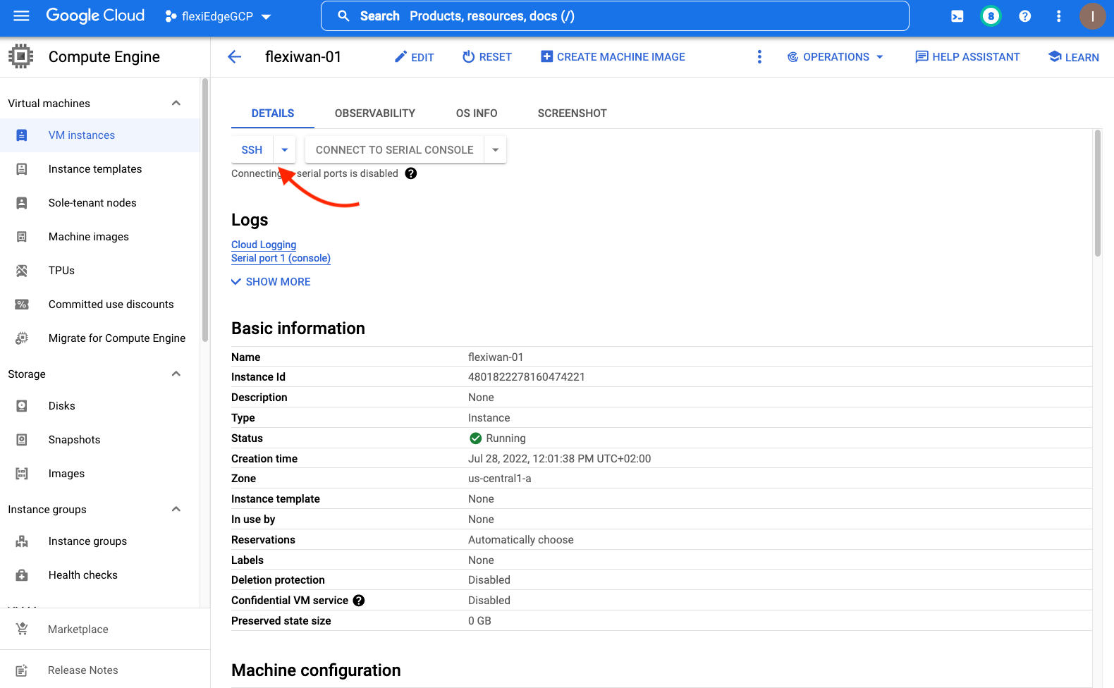 After a new VM instance is deployed and running, click on SSH button to connect to it via browser.