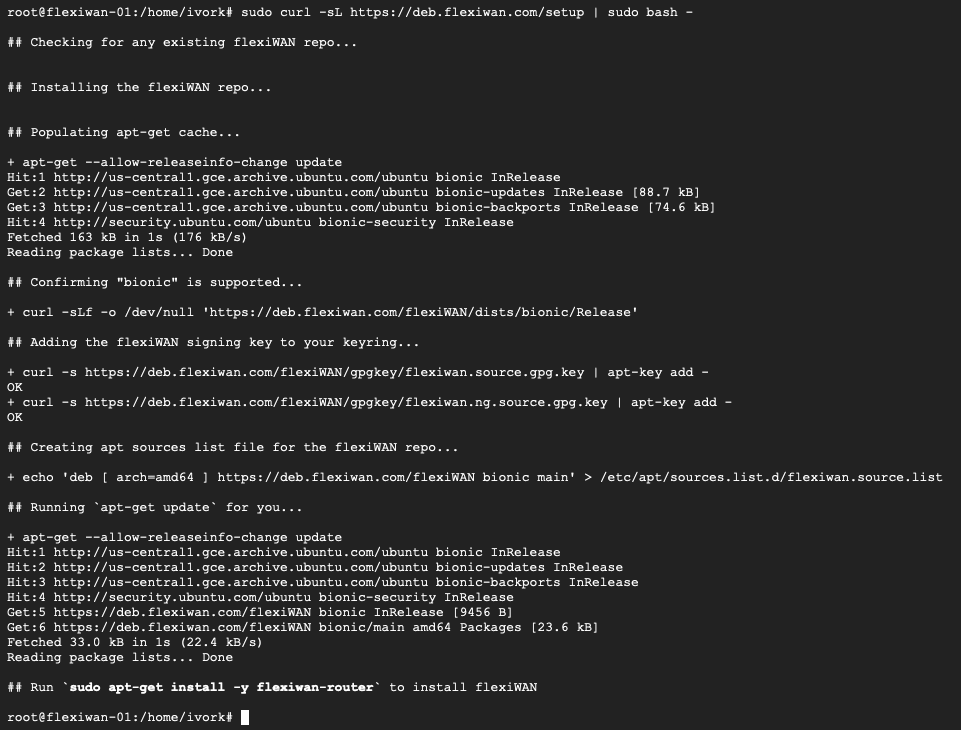2. sudo curl -sL https://deb.flexiwan.com/setup | sudo bash - - this step adds the flexiWAN respository.