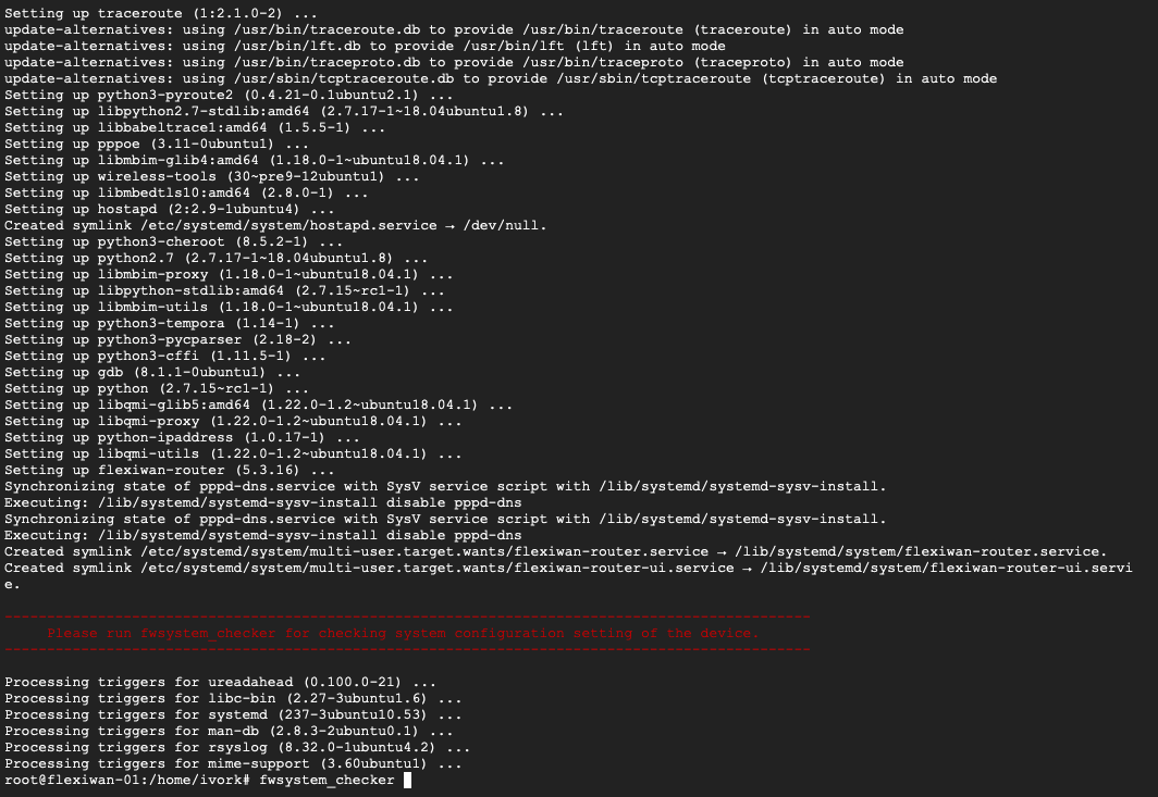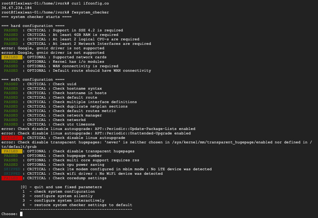 After flexiWAN installation is complete, run fwsystem_checker command to prepare the VM for flexiWAN operation. Select option 2 for quick and silent configuration, exit afterwards with 0. Follow the next section to complete flexiWAN configuration.