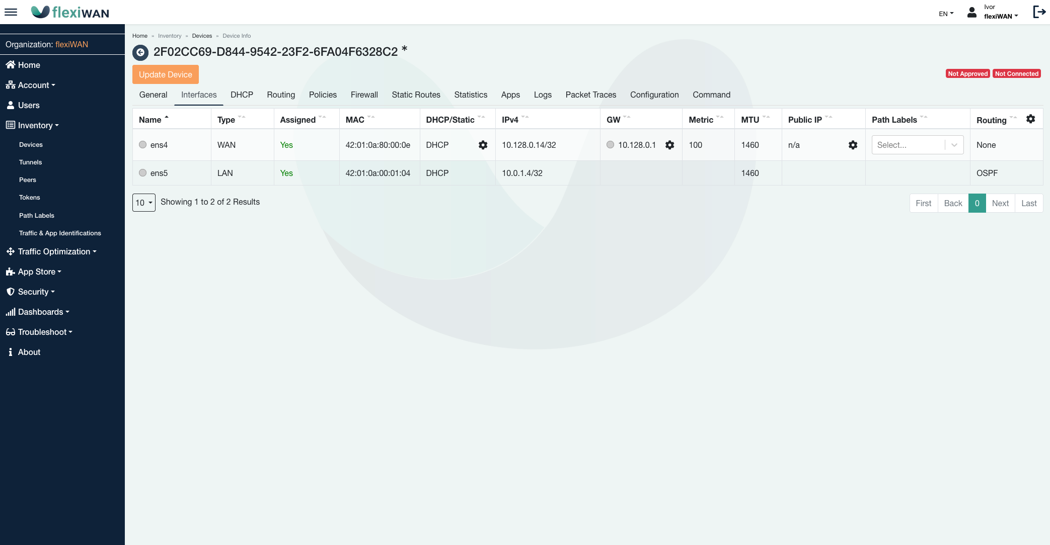 BGP neighbours can be also verified from flexiWAN side, navigate to flexiWAN device settigns and click on Update tab. Enter the following command vtysh -c "show bgp summary".