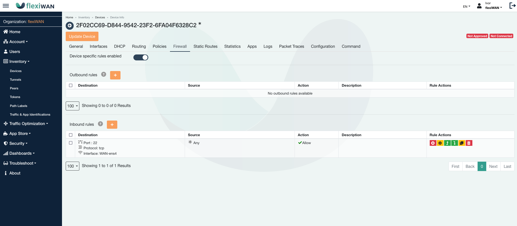 In order for the SSH session to remain active, make sure to add firewall rule allowing SSH port 22 with TCP protocol. Click on Update device to apply the changes.