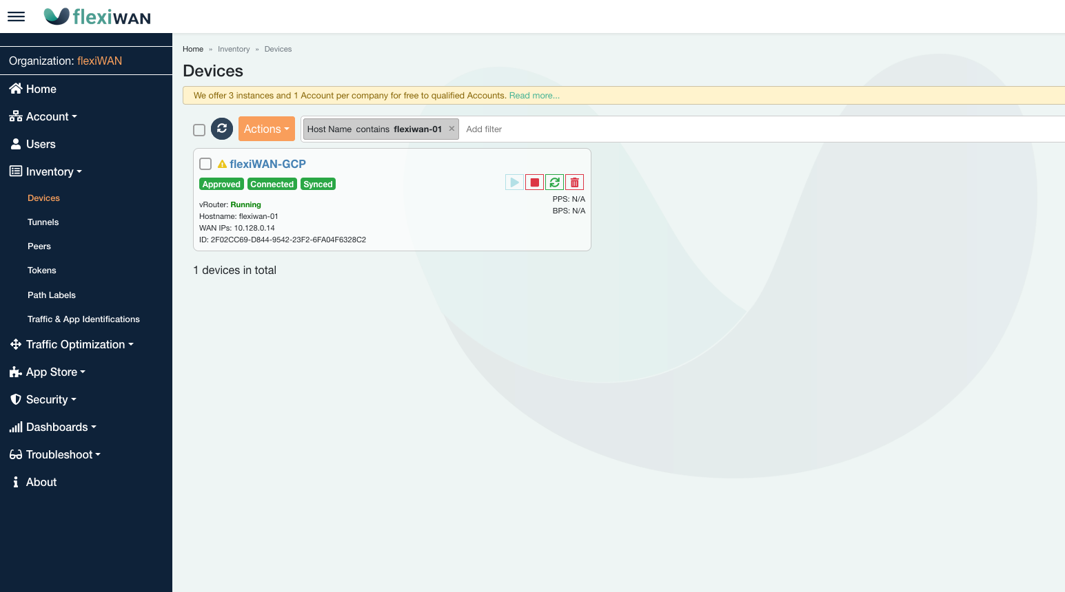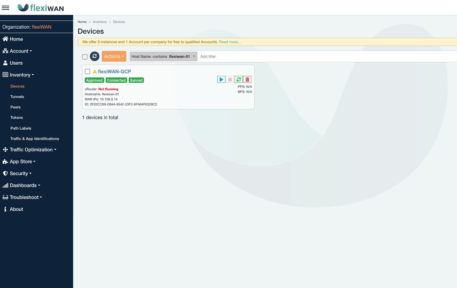 After a few moments device will be in synced status and ready to start. Finally click on start device to run flexiWAN vRouter..