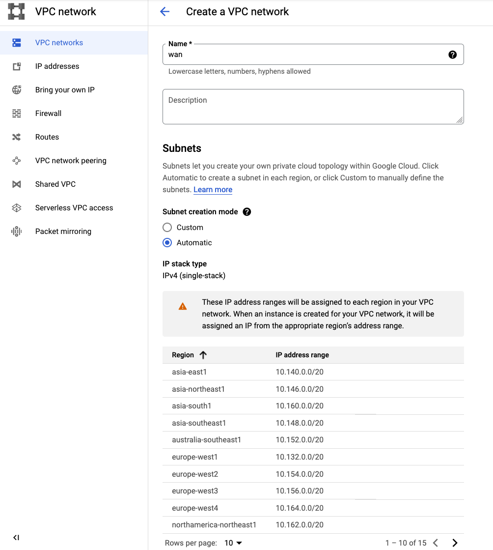Name the VPC network as wan and set subnet creation mode to automatic.