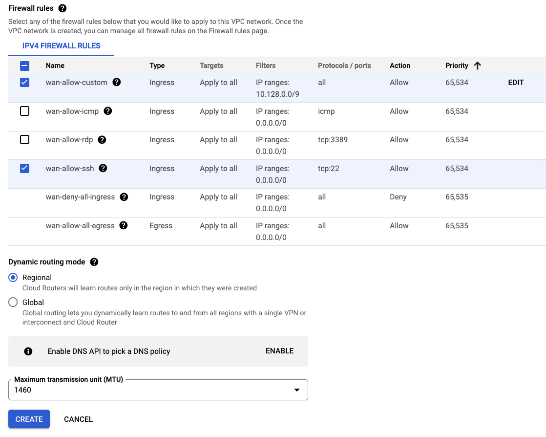 Under firewall rules enable as shown on the screenshot. Click Create to complete WAN VPC creation.