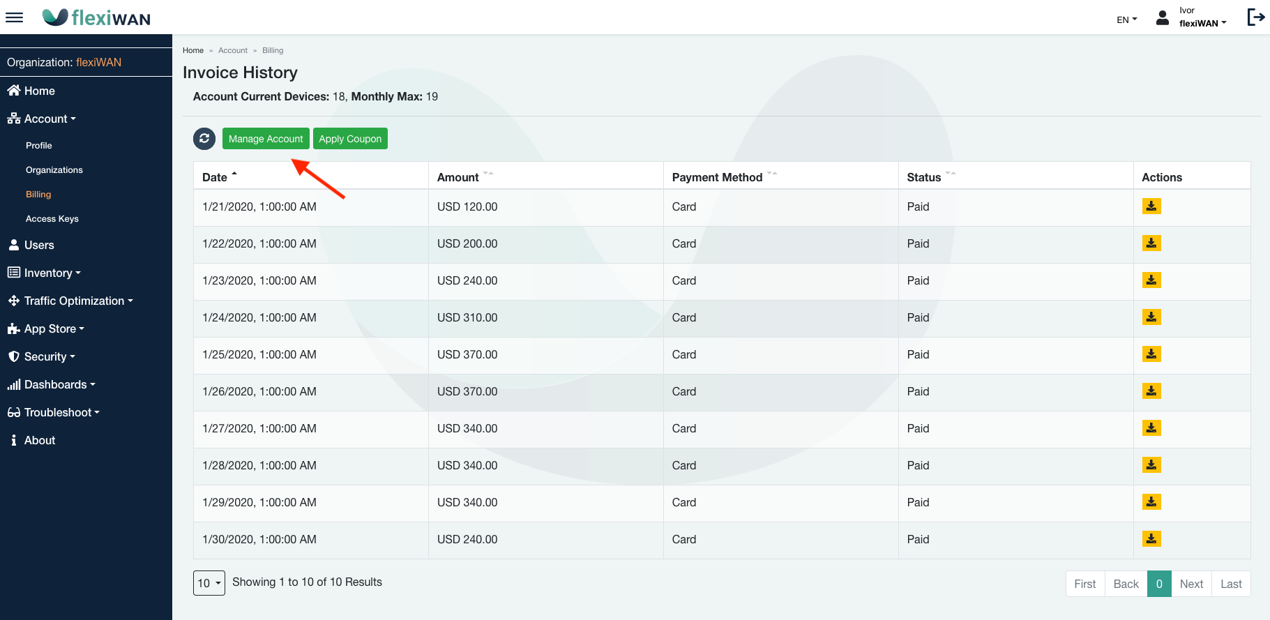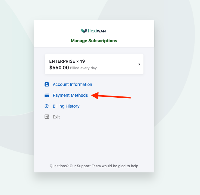 To add a payment method, click on the “Manage Account” button. This button will connect to the flexiManage billing system. Click on Payment Methods to add a new credit card.