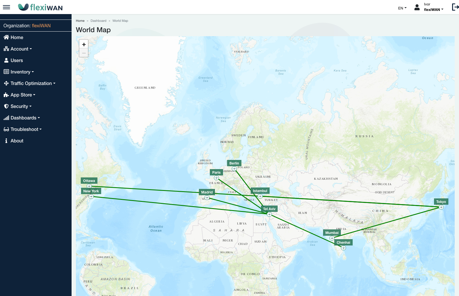 The World Map dashboard shows an approximate graphical location for each flexiEdge site as well as their connectivity status. Click on each site for more details about it. Note, information is based on IP geolocation and may not be accurate. If location is not correct, flexiEdge site icon can be drag and dropped to a different location.