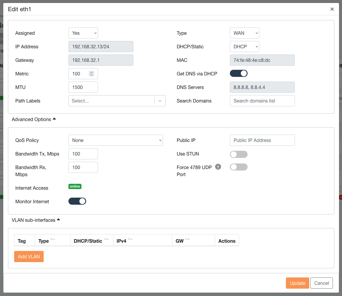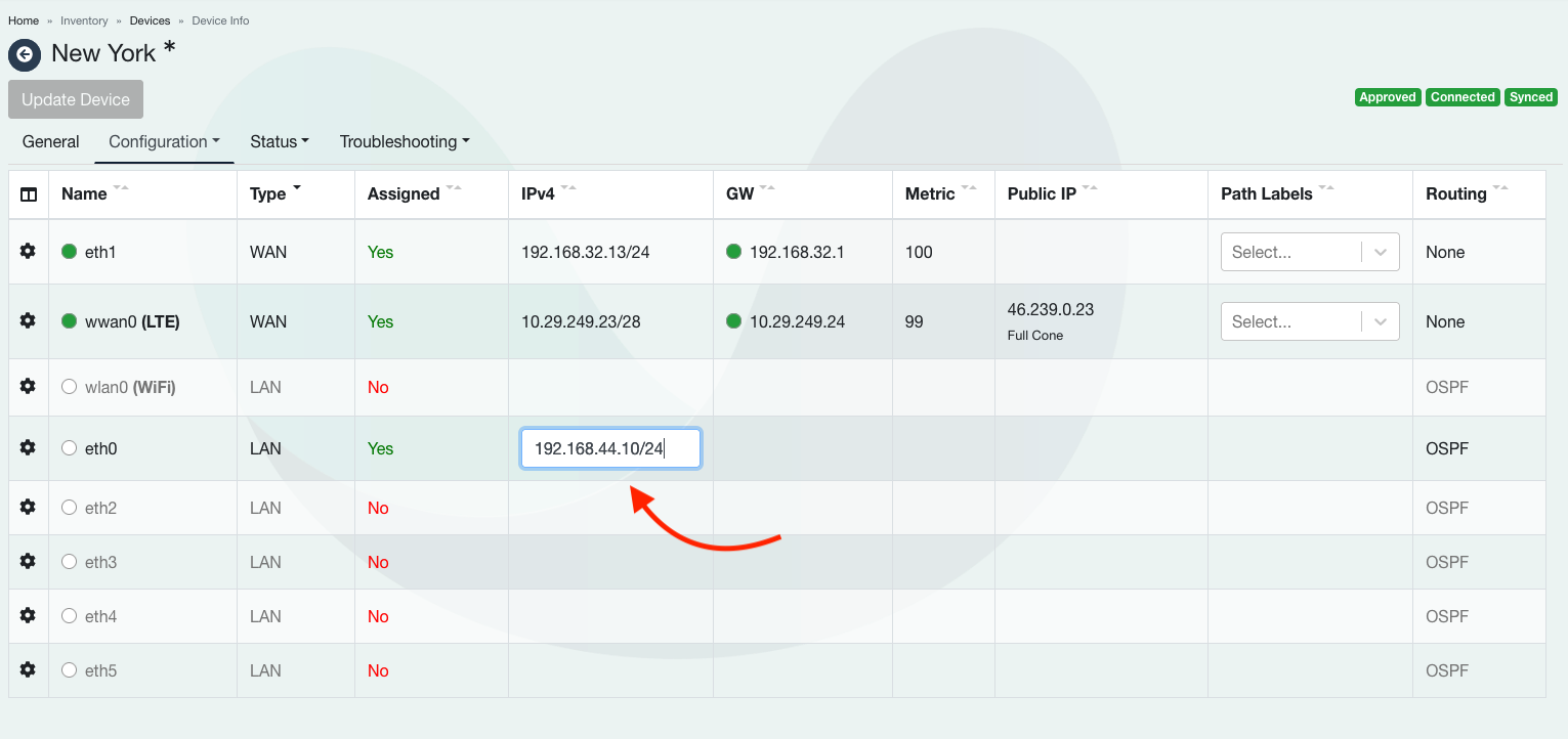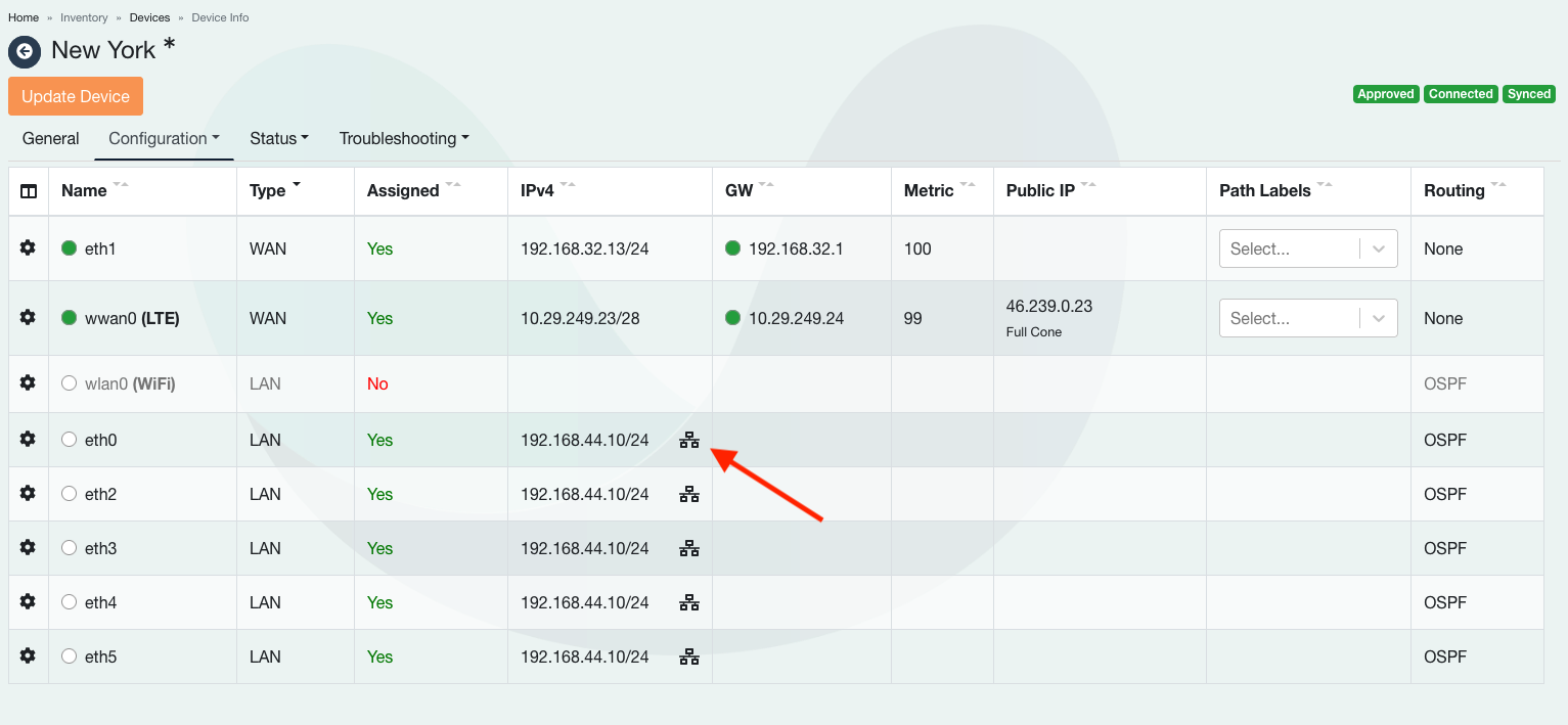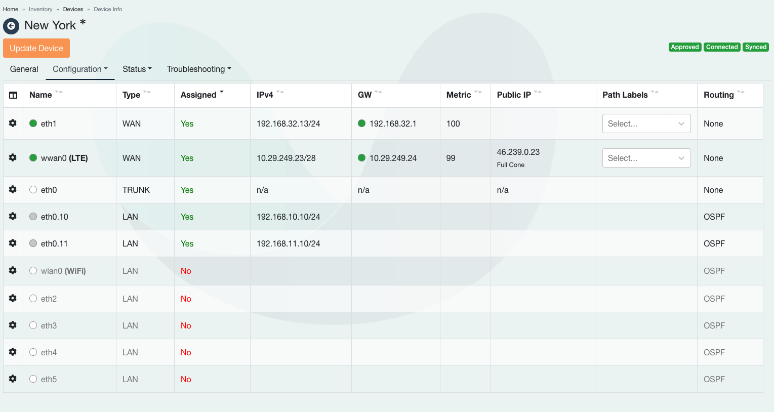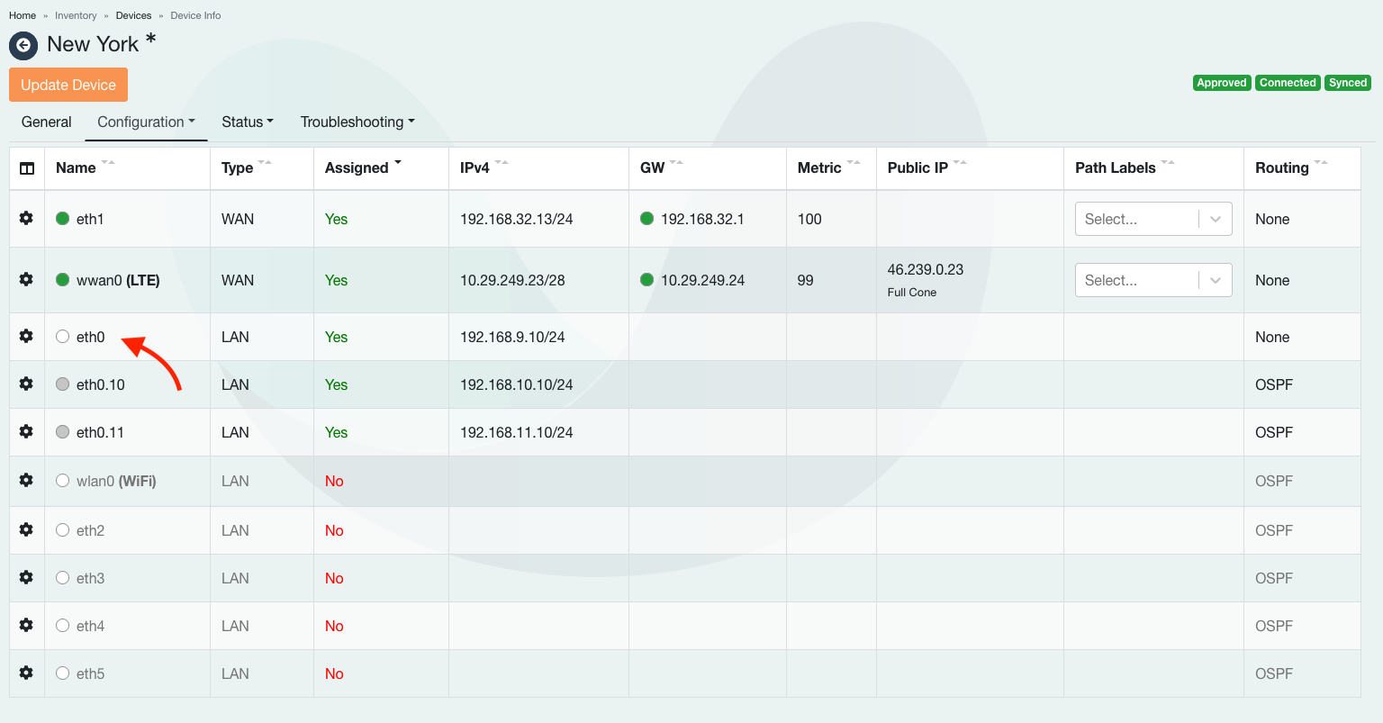 Once network interfaces are configured, click on “Update Device” button to apply your configuration.