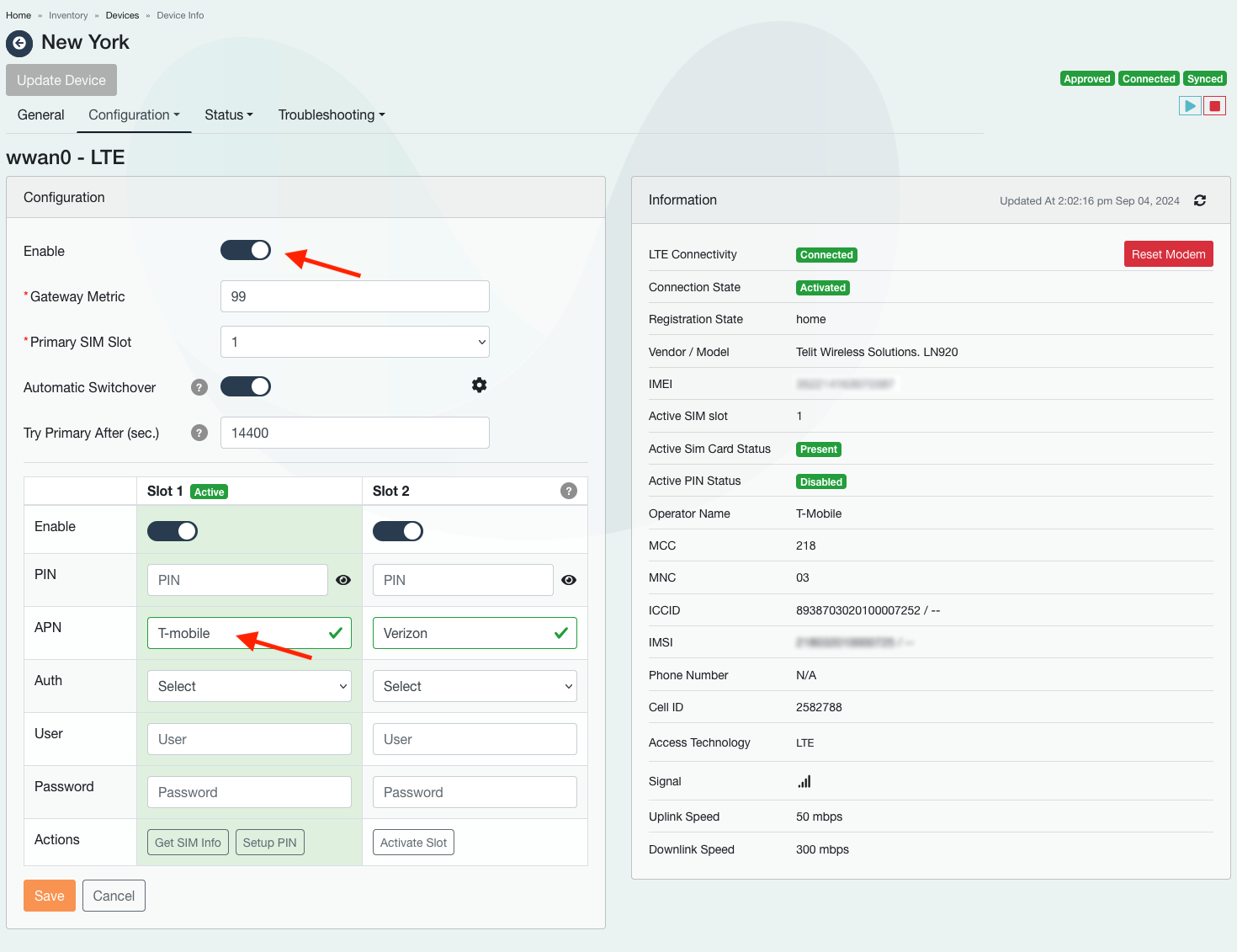 flexiWAN also supports LTE network interfaces in addition to its support for wired interfaces. To set up LTE functionality from the flexiManage environment, it’s crucial to have an active wired network interface alongside the LTE interface. This wired interface doesn’t need to be assigned but must be recognized by the system and have internet connectivity to ensure that the device stays accessible to flexiManage (common for staging and LTE only deployments).