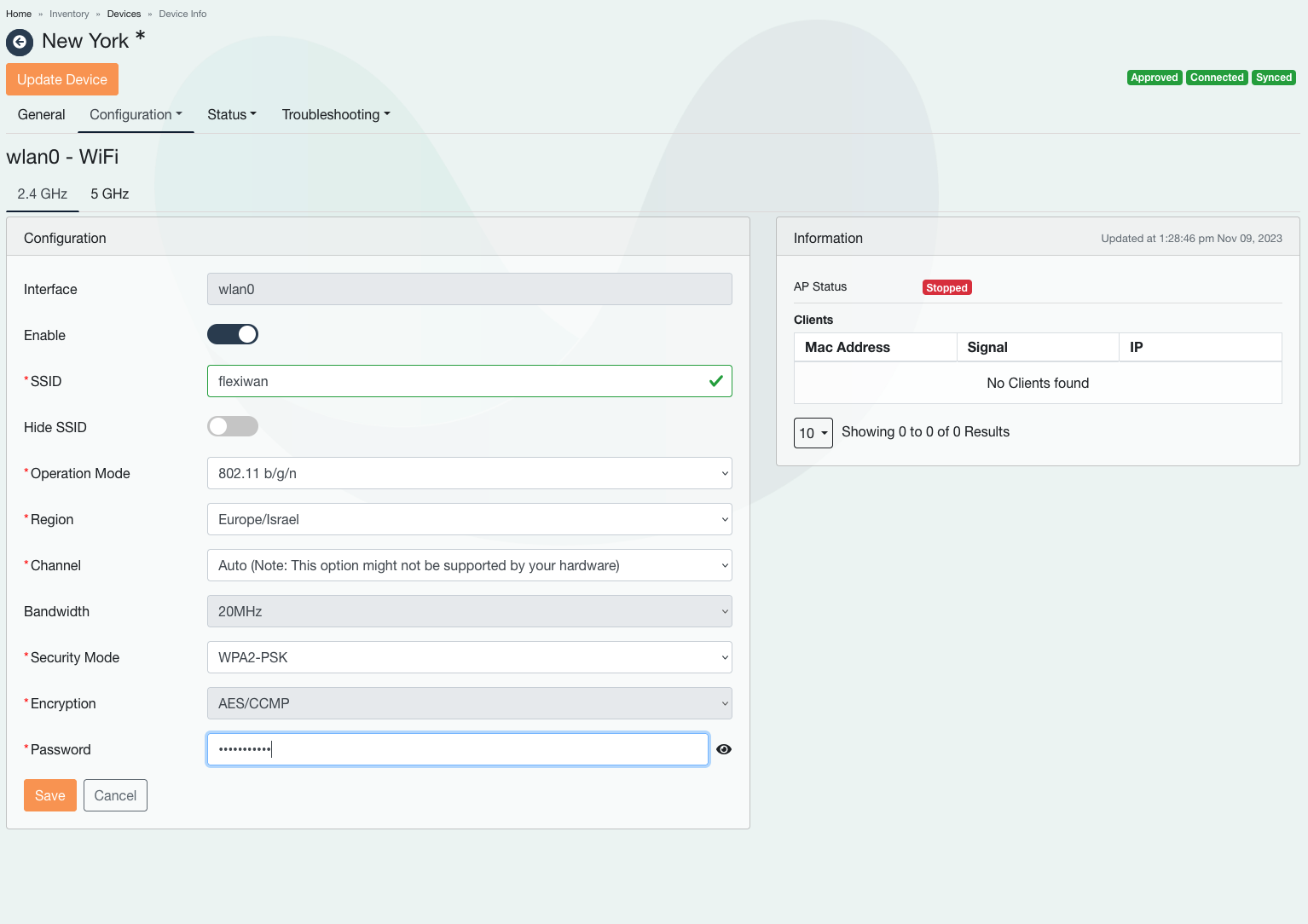 Enter WiFi AP settings and click save at the bottom of the page. Make sure to also click on “Update Device” while on Interfaces page.