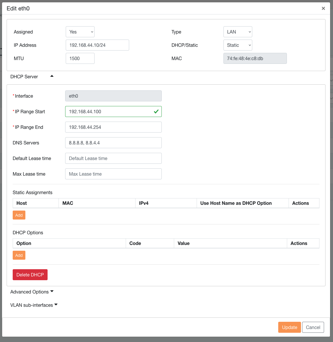 That’s it, two new VLAN sub-interfaces are added and configured as LAN. Finalize by clicking on Update device in top left corner. Note, don’t forget to add DHCP server to each of newly created LAN interfaces.