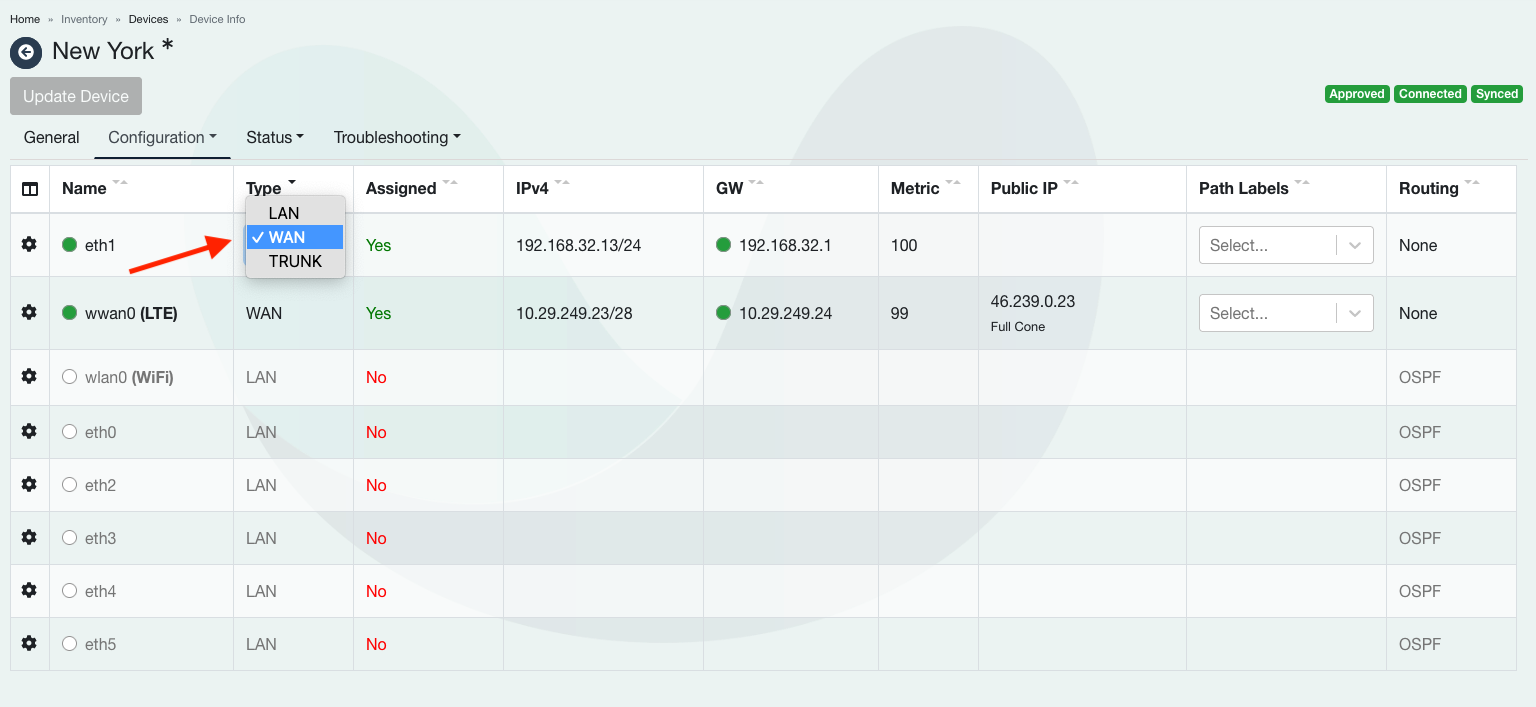 Type - Marks interface as WAN, LAN or TRUNK. flexiWAN requires at least one WAN and LAN for operation. Multiple WAN and LAN interfaces are supported. TRUNK is used for VLAN operation.