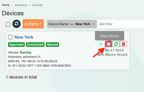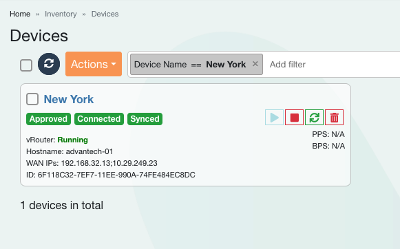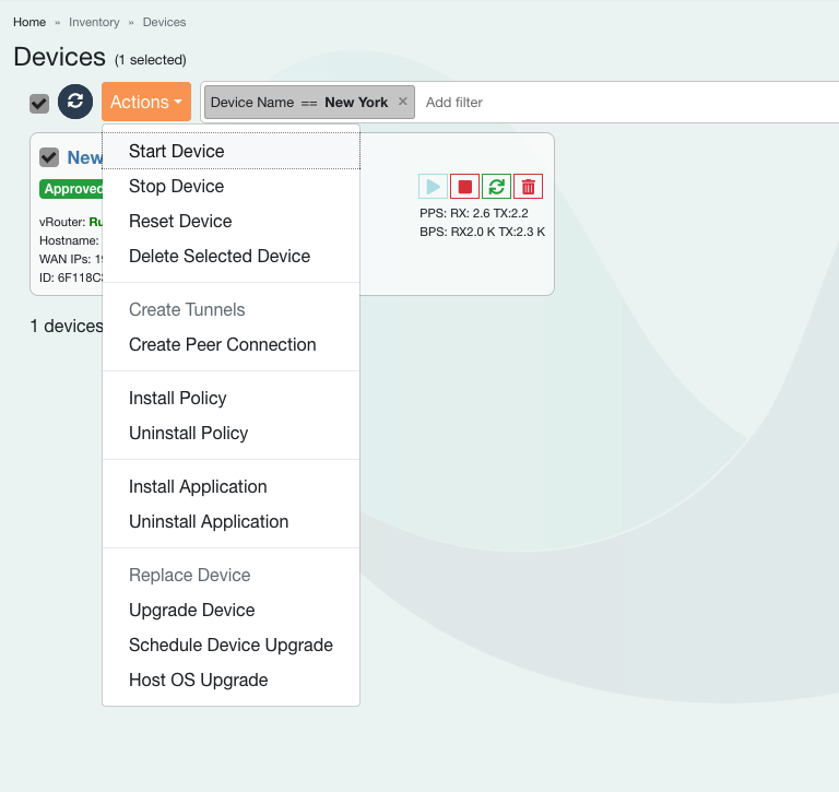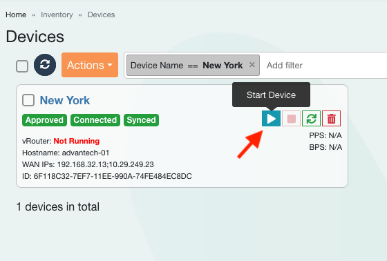 Once the device has been configured, it is linked to the management system, but the router itself is not yet operational. In this state, flexiWAN has not been initiated. To initiate the flexiWAN router, simply click on the “Start Device” icon.