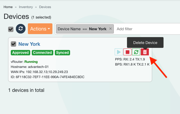 To delete a device click on the “Delete Device” button. Make sure to delete all Tunnels connected to that device before attempting to delete it.