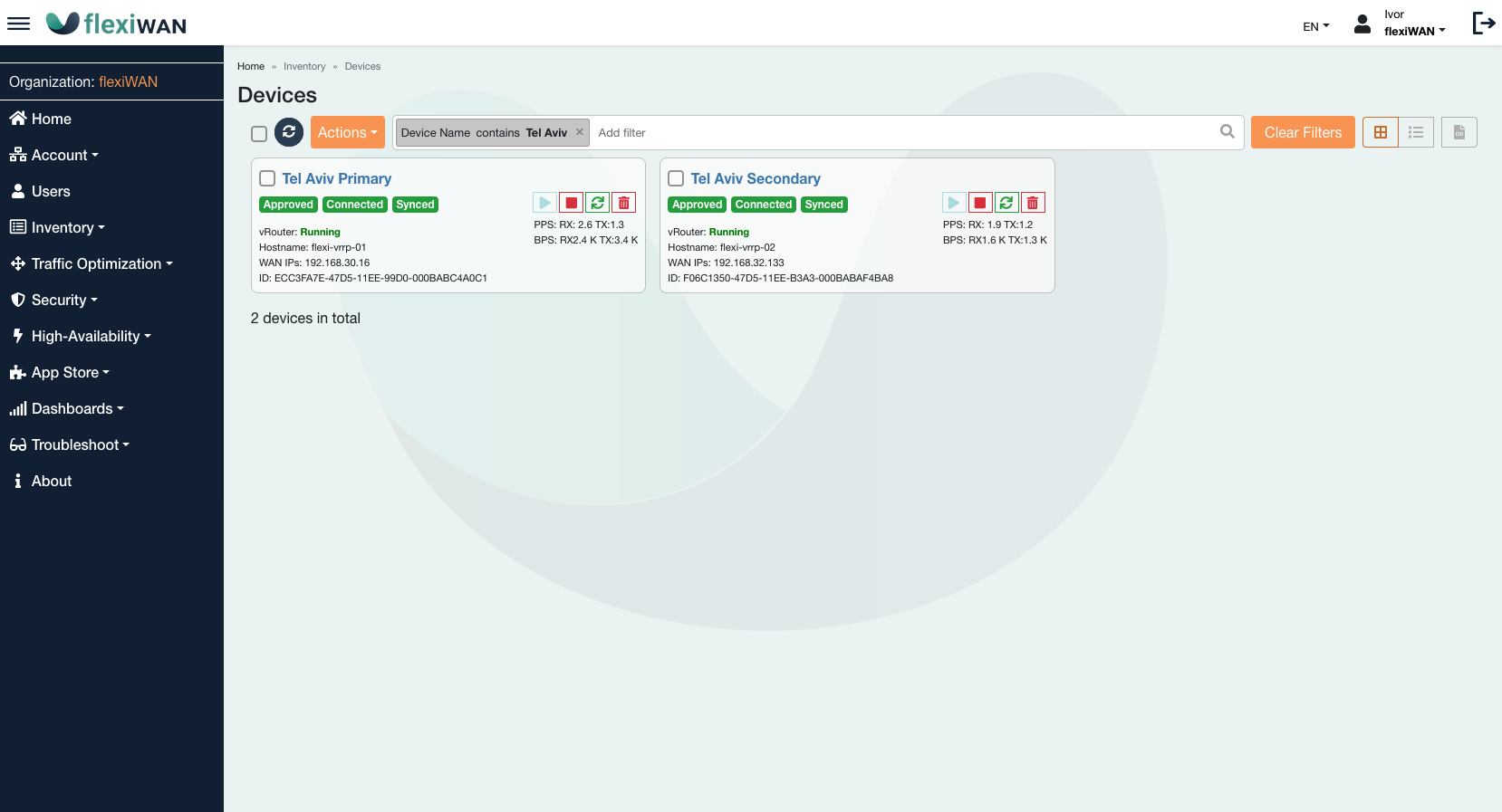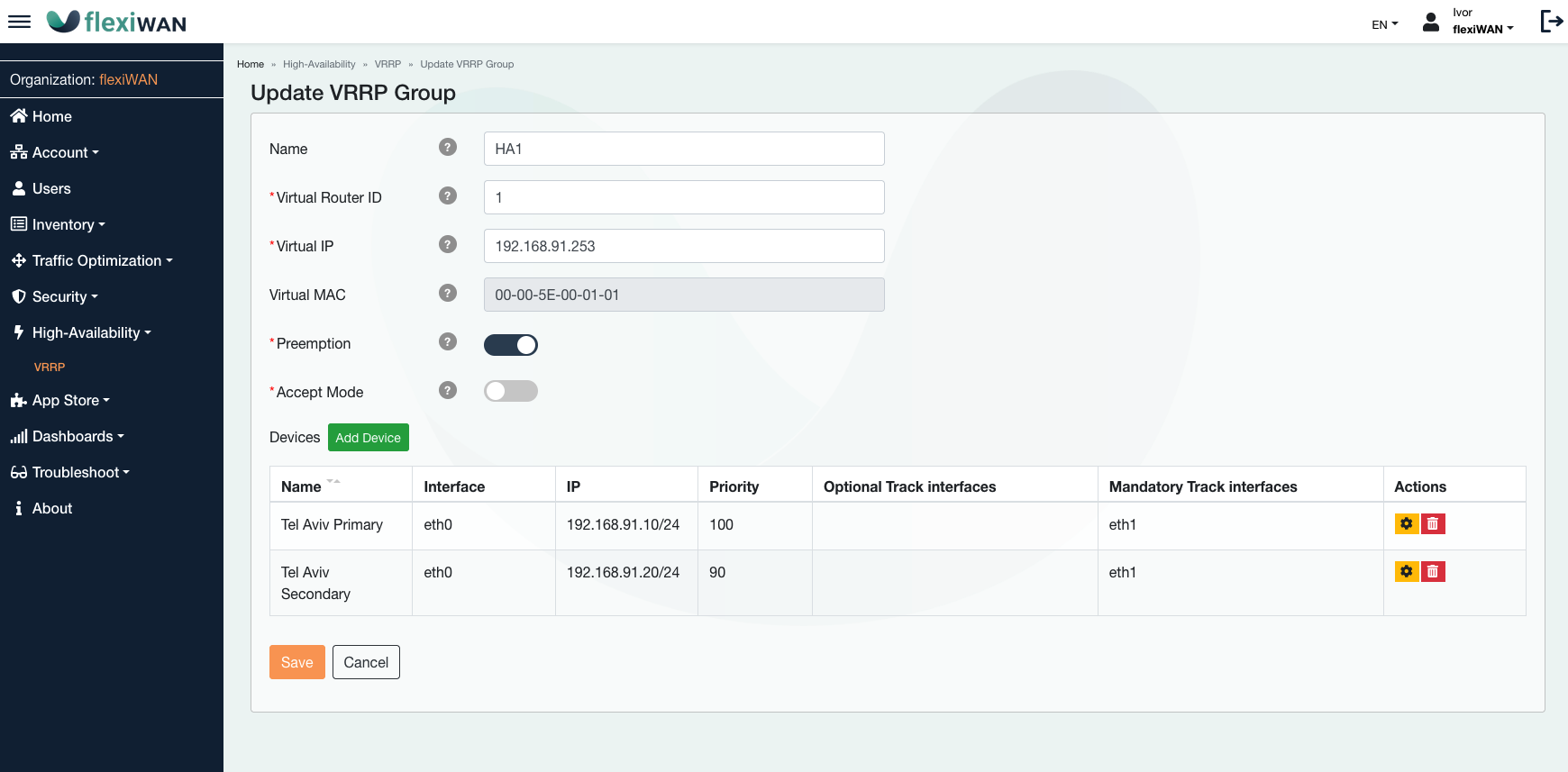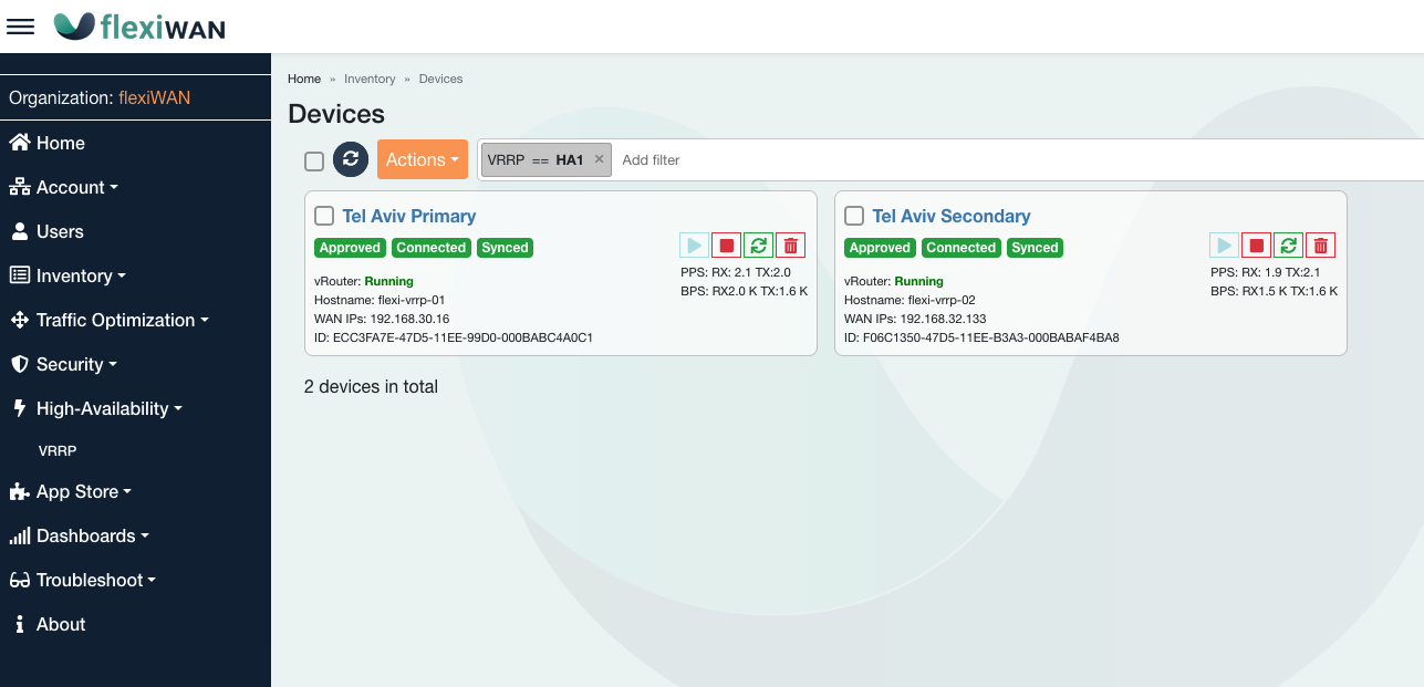 In addition to high availability with VRRP, flexiWAN also includes and have out-of-the-box working WAN and tunnel redundancy for each of the devices.