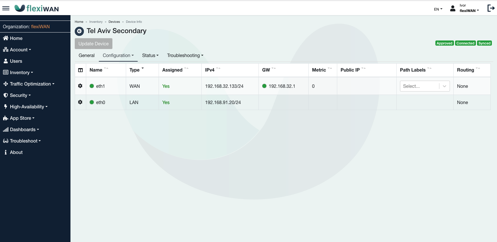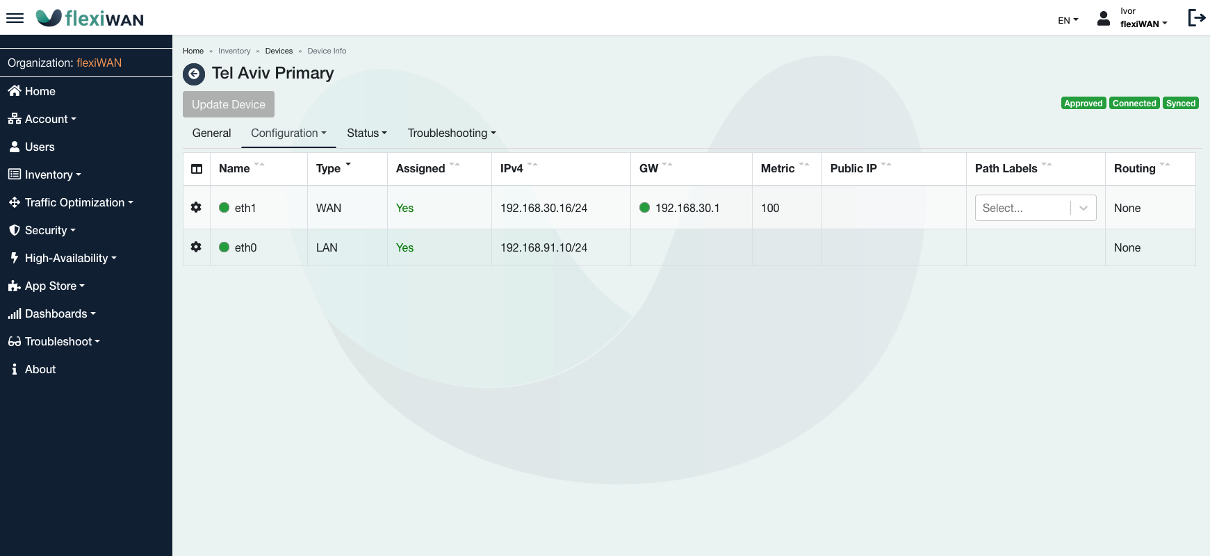 Navigate to the first flexiEdge and verify WAN and LAN are assigned. Take note of LAN interface IP and network range, in this case 192.168.91.10/24.