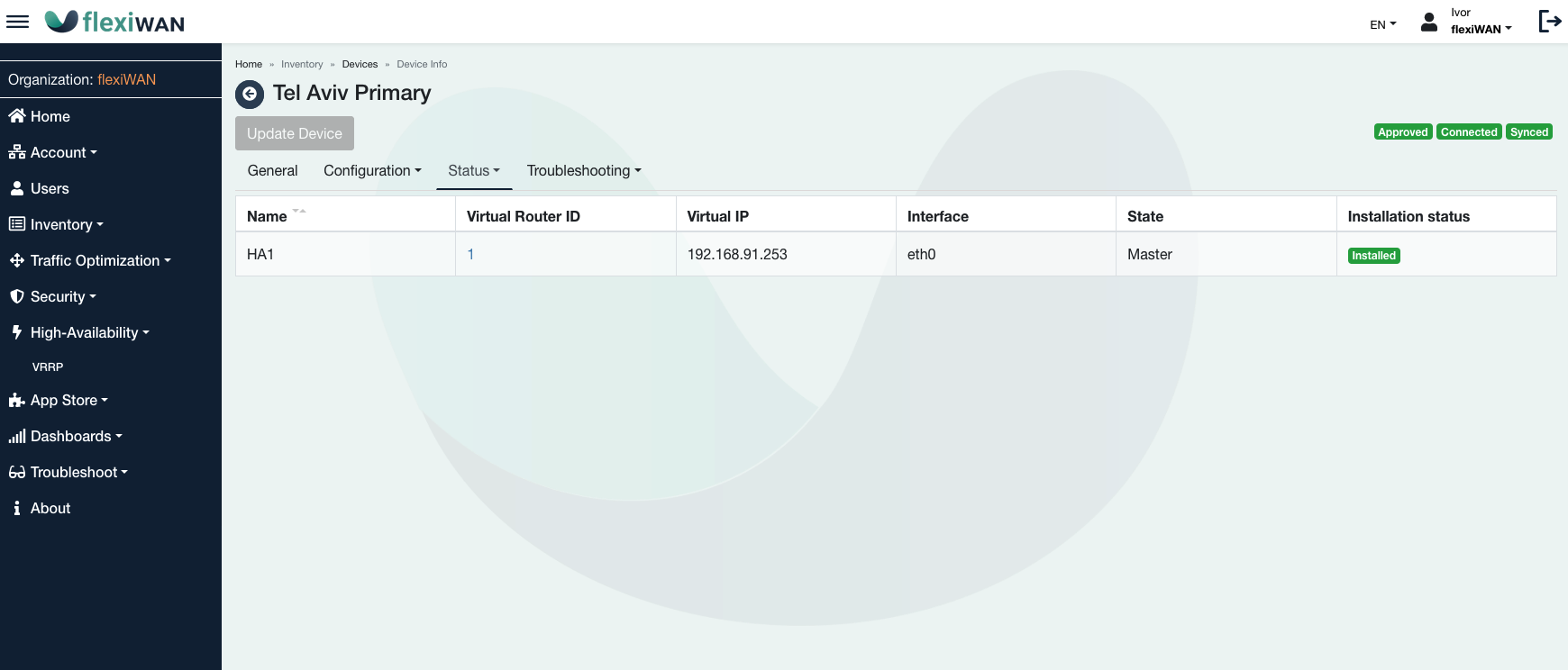 In order to confirm High Availability is sucesfully deployed and work it, test it by unplugging the network cable from the primary node. To check which node is primary, simply navigate to a device within the HA group and from the Status menu, click on VRRP.
