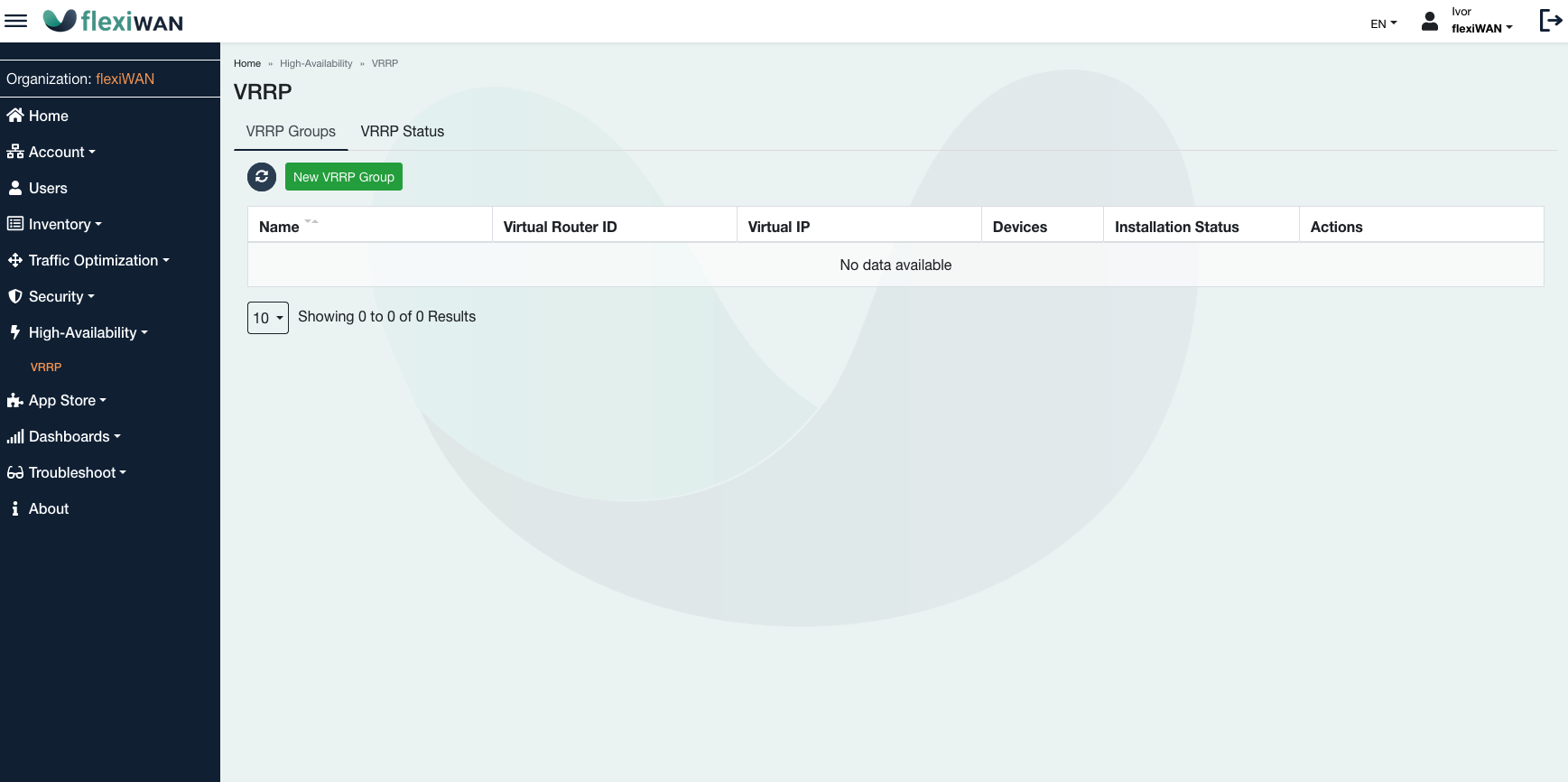 After preparing the flexiEdge nodes, from the side menu click on High Availability > VRRP. Click on New VRRP Group to start the configuration.