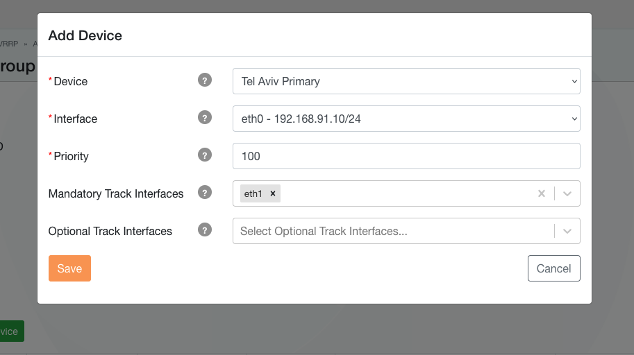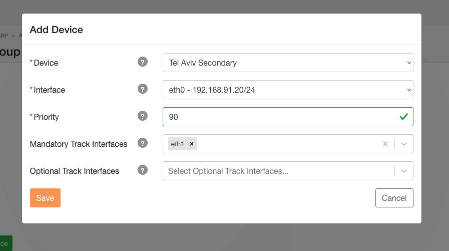 Mandatory track interfaces - Select additional interfaces which are mandatory for the device to remain as Master. If any of the selected interfaces goes down, node will switch to backup.