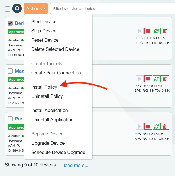 After successfully creating a policy, navigate to Inventory > Devices page in order to install the policy. The procedure is very similar to the way tunnels are added. Simply select one or multiple devices and click on the action button.