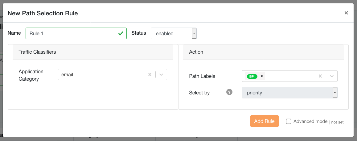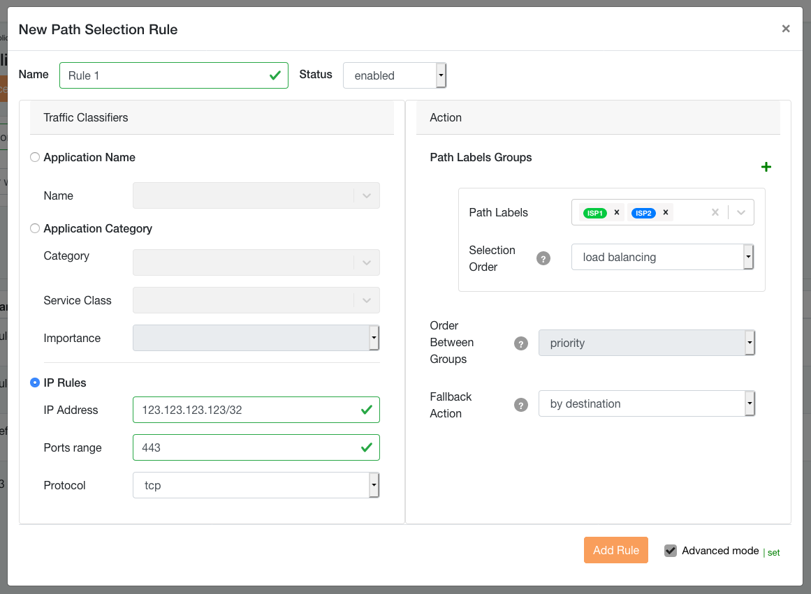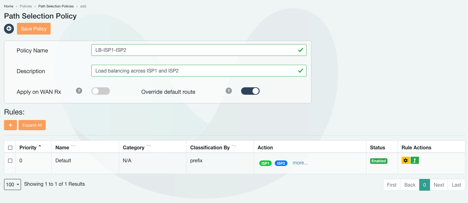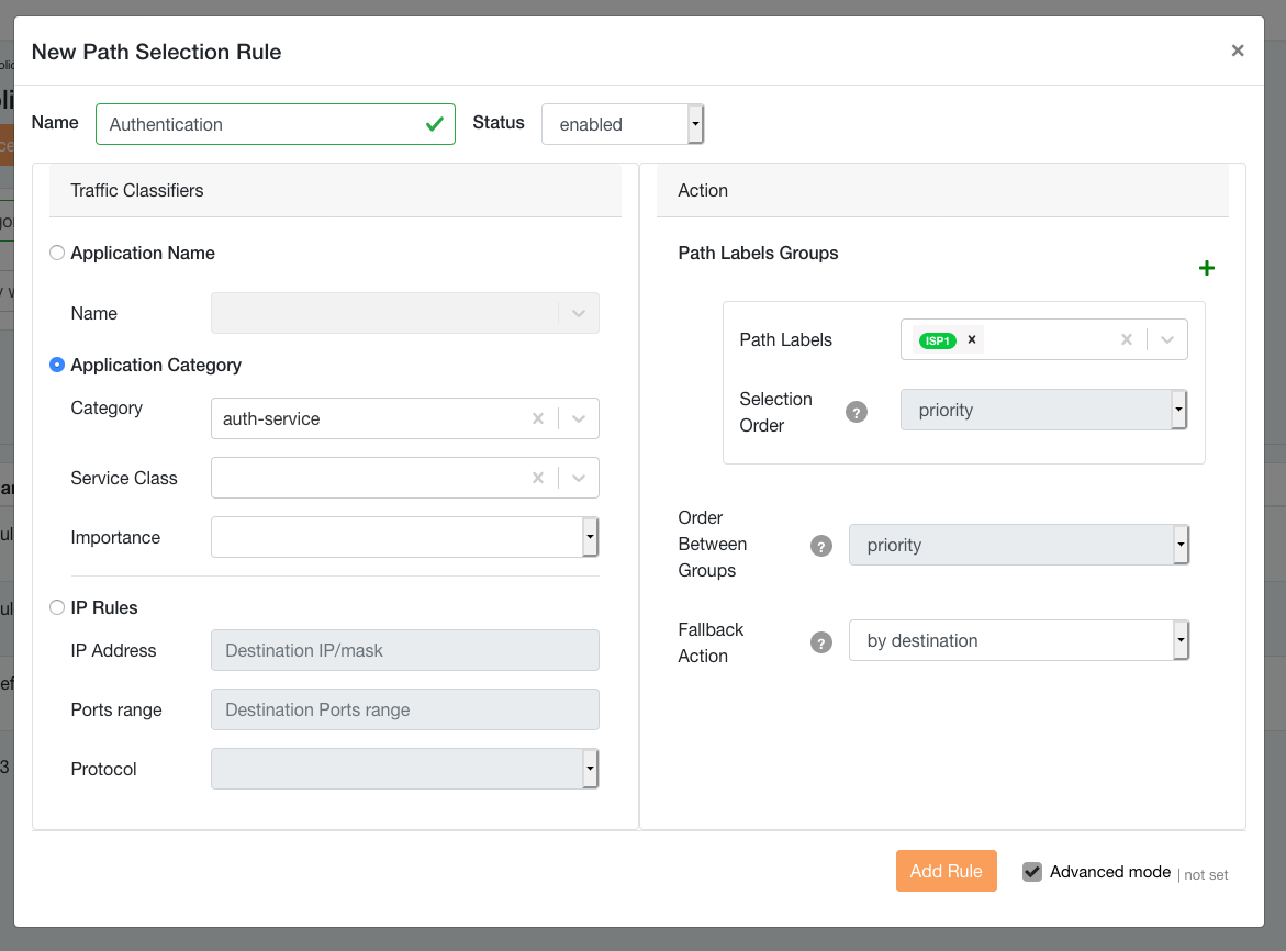 Fill in the rule as screenshot above and click add rule. This rule will prioritize the ISP1 label over ISP2 and act as failover in case ISP1 is unavailable.