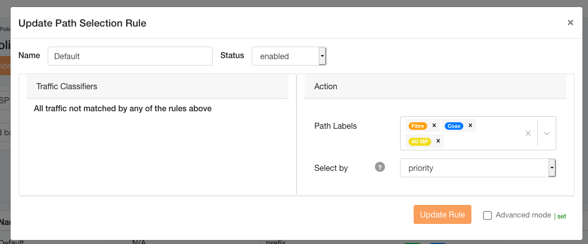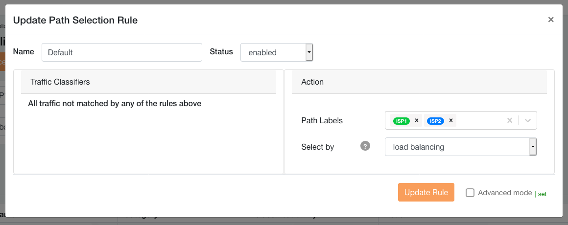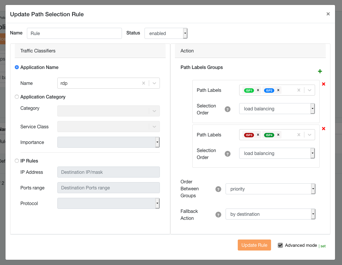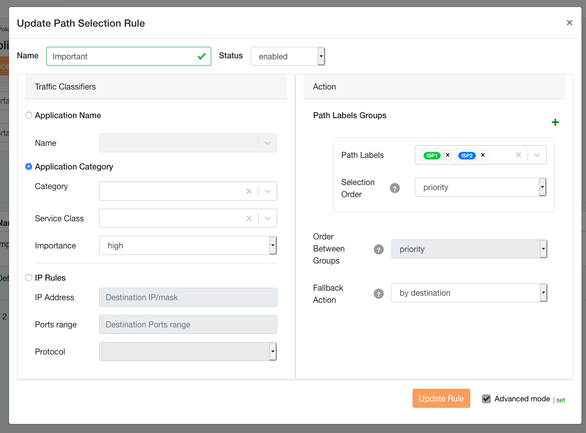Fill in the rule as screenshot above and click add rule. This rule will prioritize the ISP1 label over ISP2 and act as failover in case ISP1 is unavailable.
