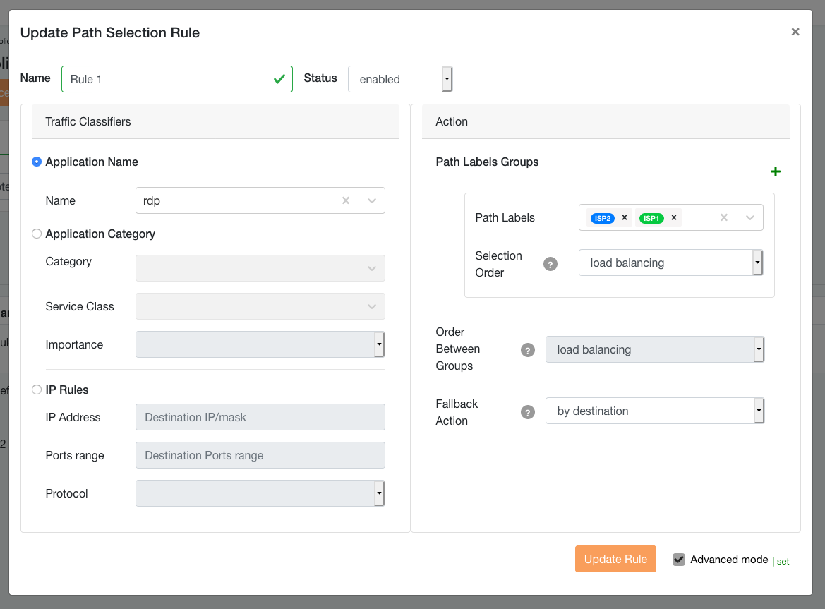 Under Rule Actions, click on the settings icon and enable the rule from the Status drop-down. Add ISP1 and ISP2 path labels in the Action > Path Labels section. Finally from “Select by” choose “Load balancing”.