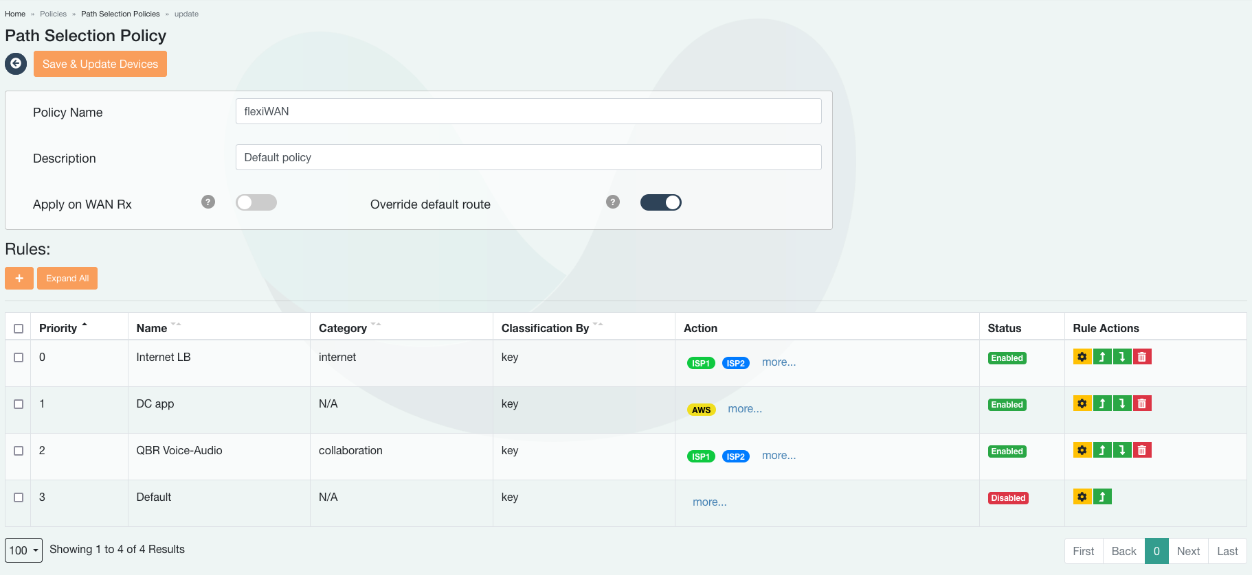 Path Selection Policy is available from Traffic Optimization section in side bar. Multiple policies can be defined and different devices can have their own separate policies, however a device can have a single policy installed. Path Selection policy contains rules, and each policy can have a single or multiple rules.