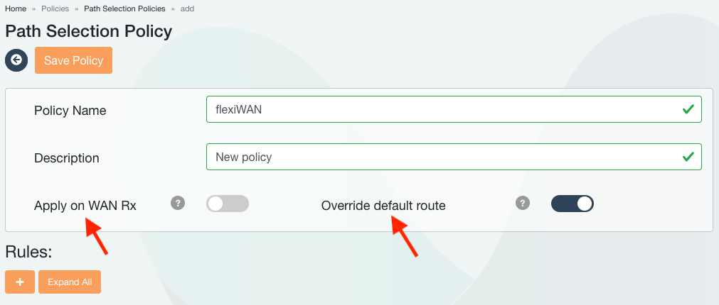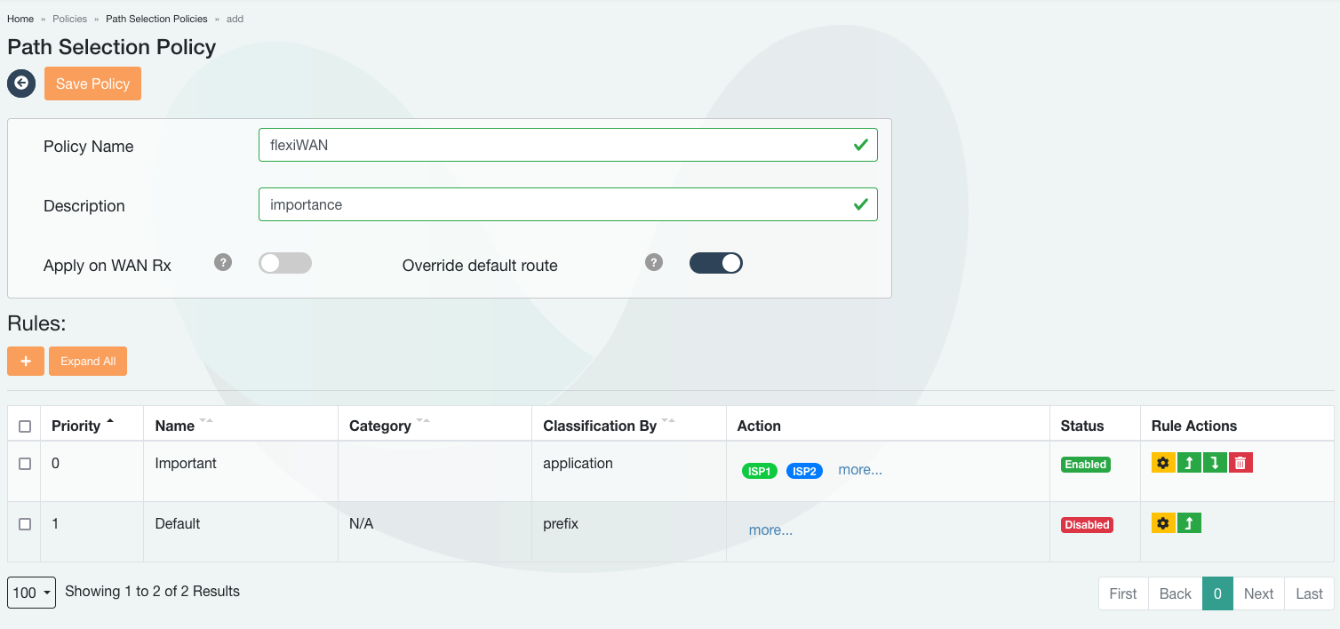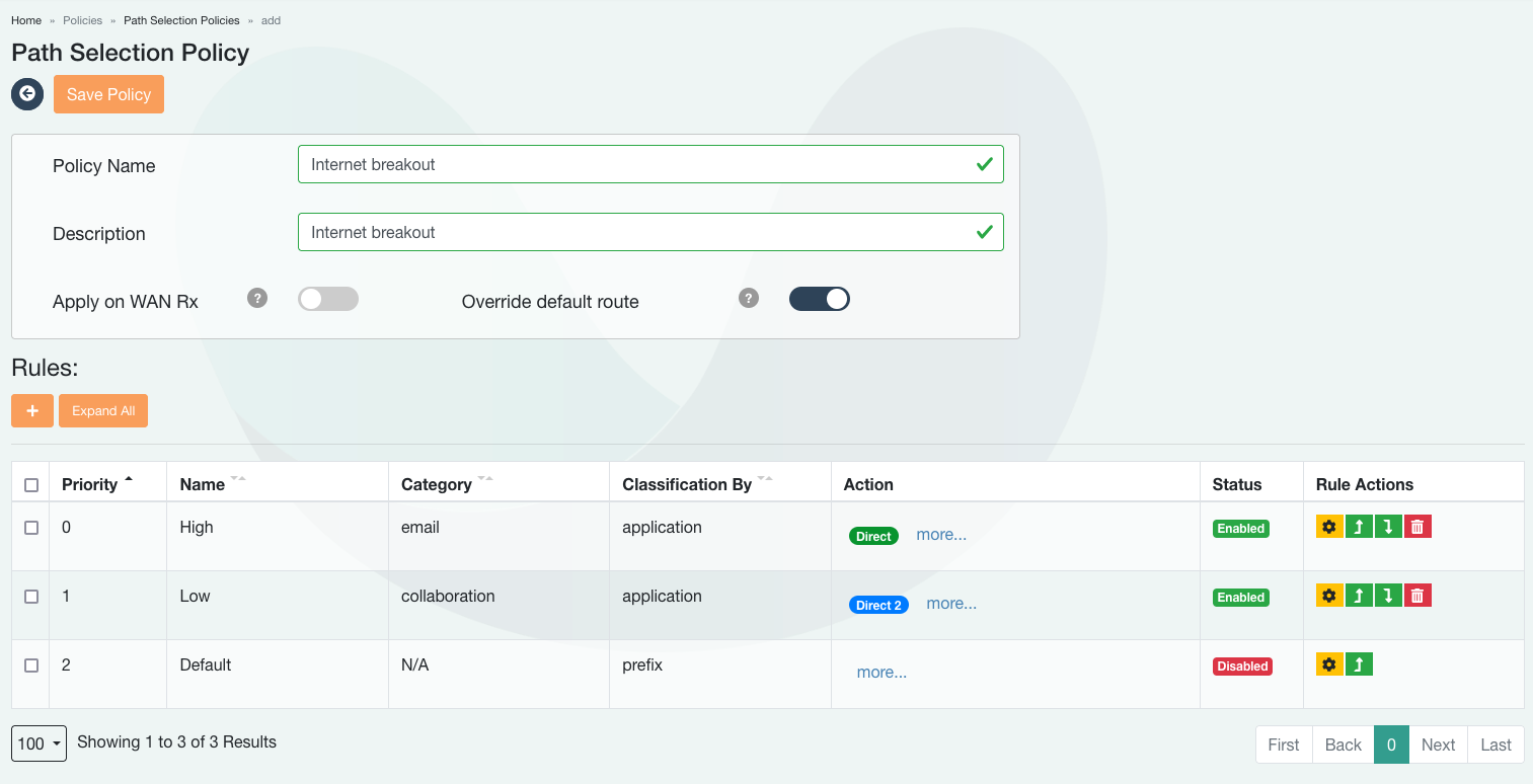 Each policy contains rules in which users can configure application based routing parameters. Every new policy has a “Default” single rule which is disabled by default, with the purpose to match all traffic that is not matched by other higher priority rules.