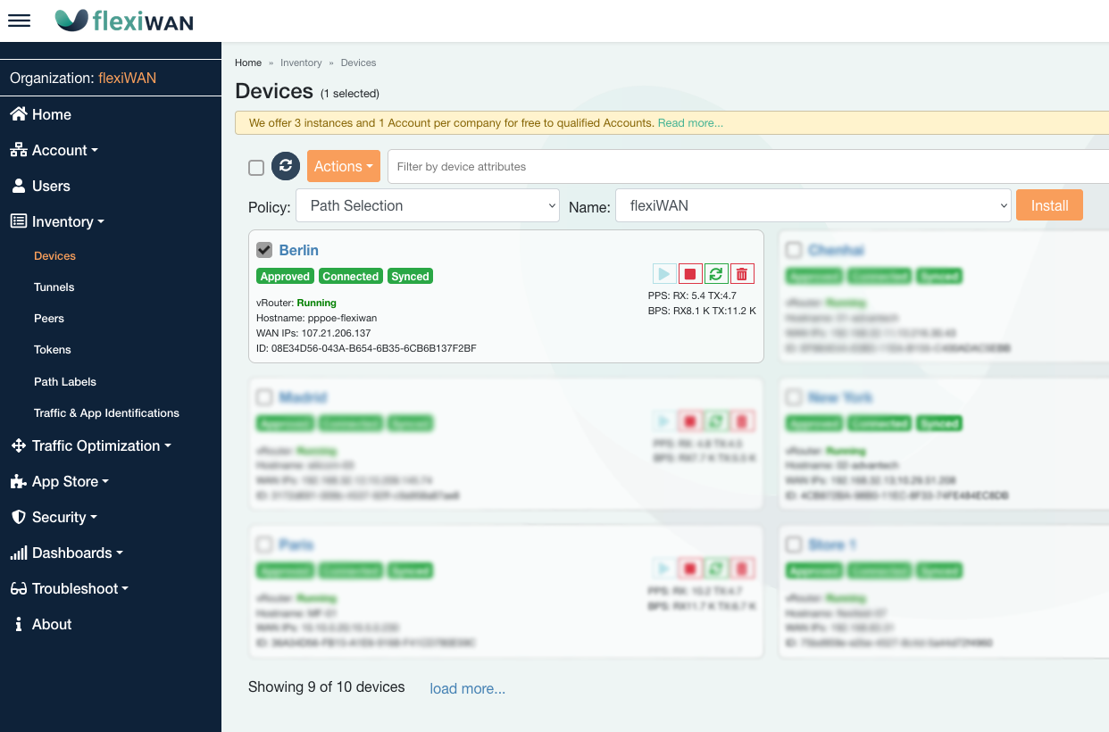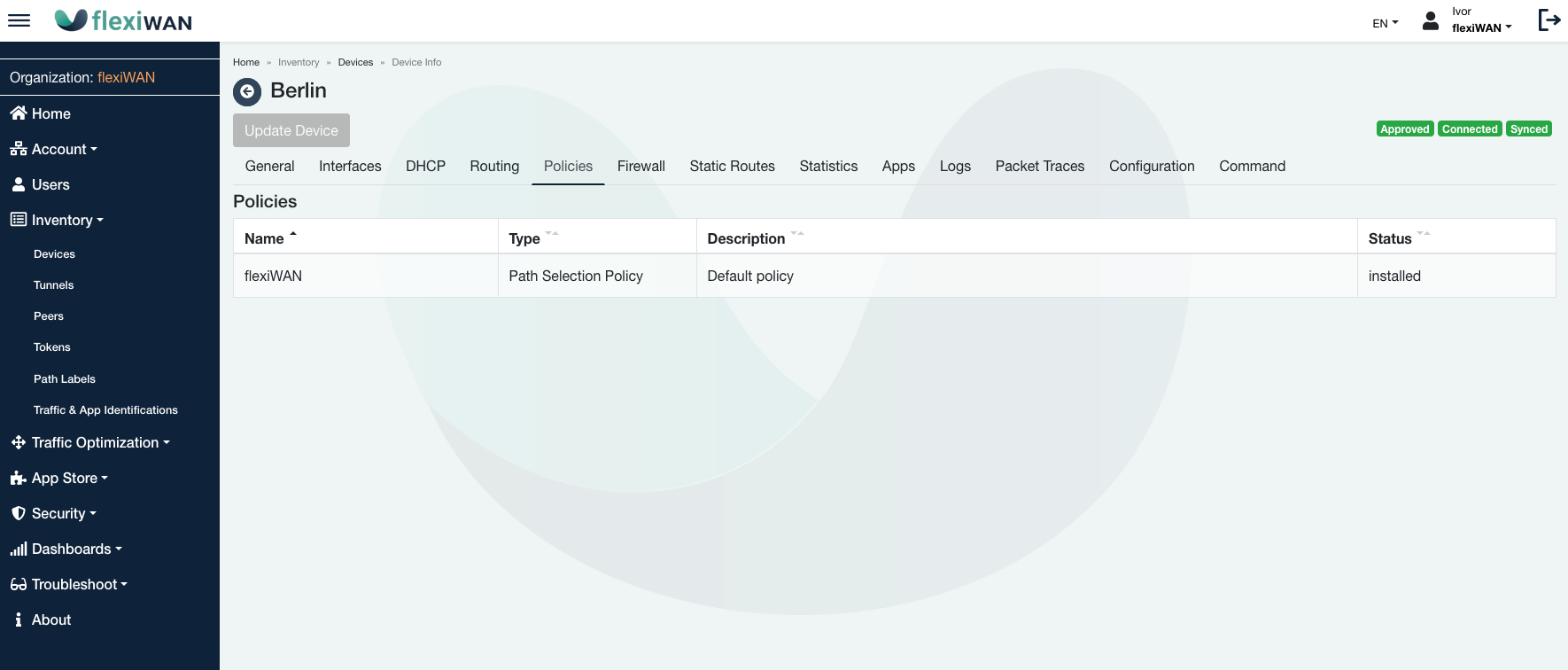 That’s it, that’s all it takes to enable multi-link failover with flexiWAN. Confirm the rule is configured correctly and save it. Navigate to the Inventory > Devices and install the Path Selection Policy to the device which has the three path labels / internet connections assigned.