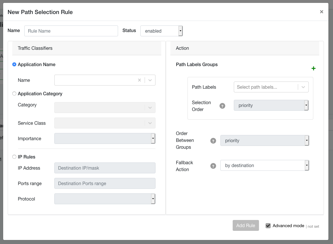 Navigate to Traffic Optimization > Path Selection and click on “New Policy”. Enter the Policy Name and its description. Click on + sign to add a rule. In the new rule click on “Advanced mode” checkbox.