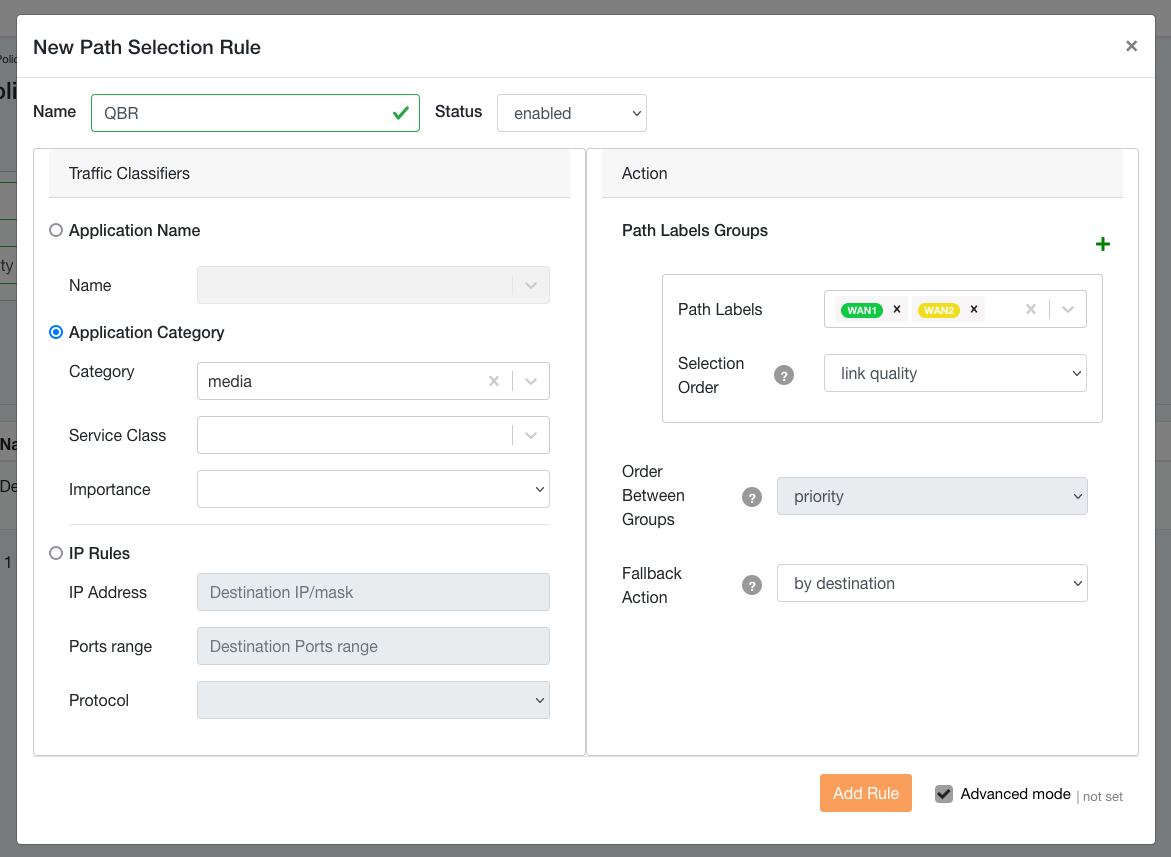 Navigate to Traffic Optimization > Path Selection and add a new policy. Click on a + sign to add a new rule and enable advanced mode. Configure the rule to use “Media” category and add the previously created Path Labels WAN1 and WAN2.