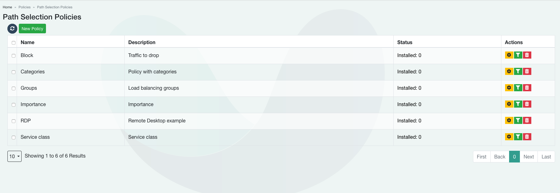Path Selection Policies page shown below contains multiple example policies. Policy page provides installation status of policies as well as actions to: