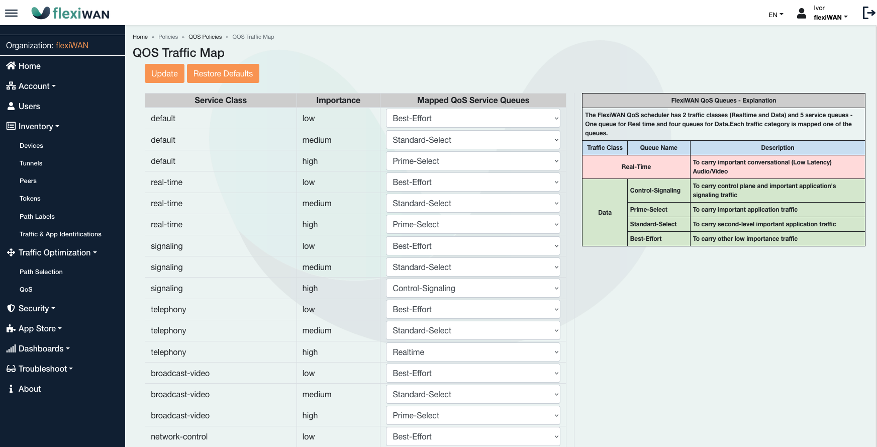Quality of Service policies, through which QoS plan can be configured using weights across QoS queues. Configured policies are deployed in same fashion like other features with policies, allowing quick installation to multiple flexiEdge devices at the same time.