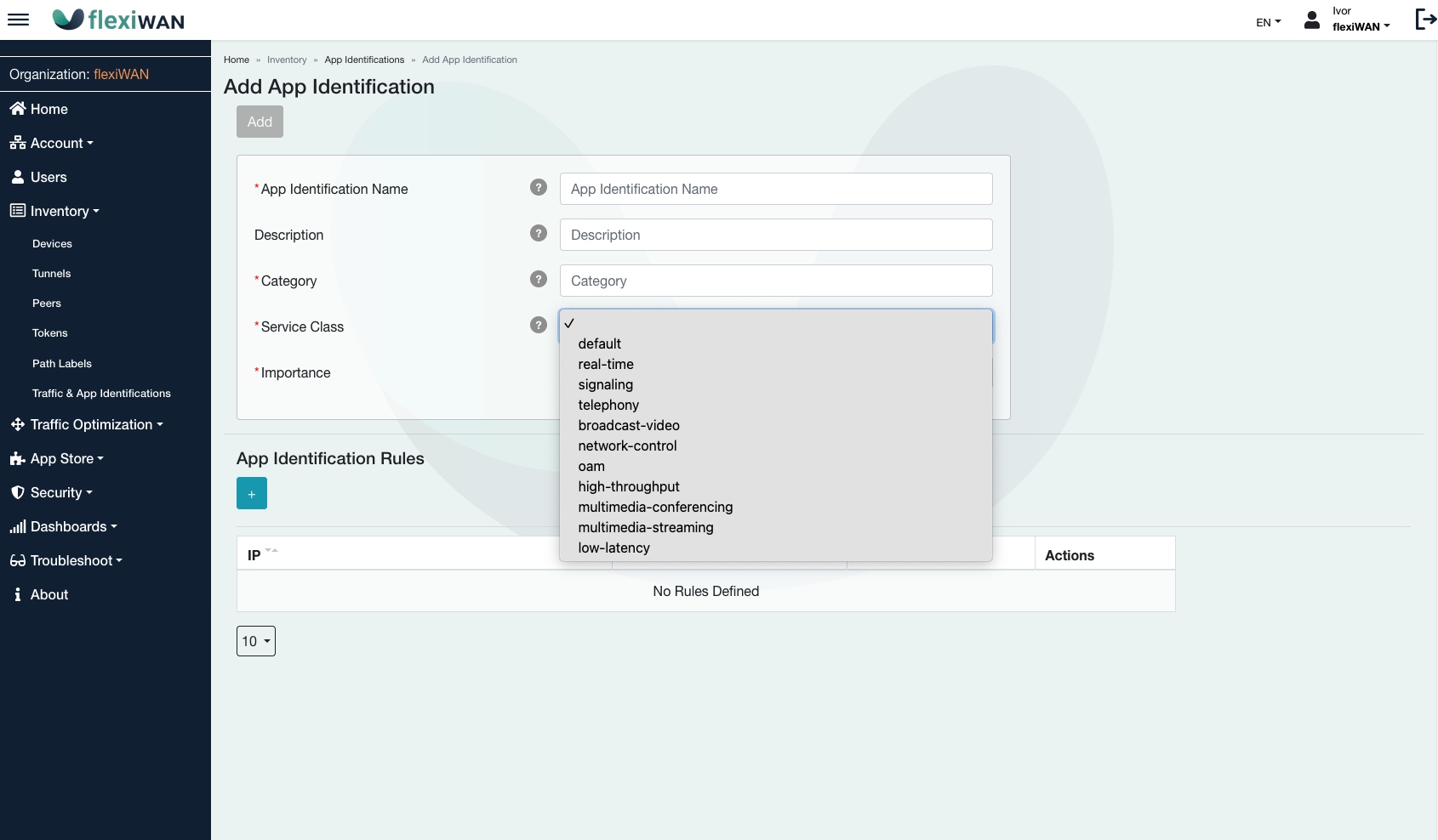 Each of the built-in Application Id’s have service class defined. New Application Id’s can also have service class defined. To learn more how Traffic & App identifications work, visit Traffic & Application Identifications section.