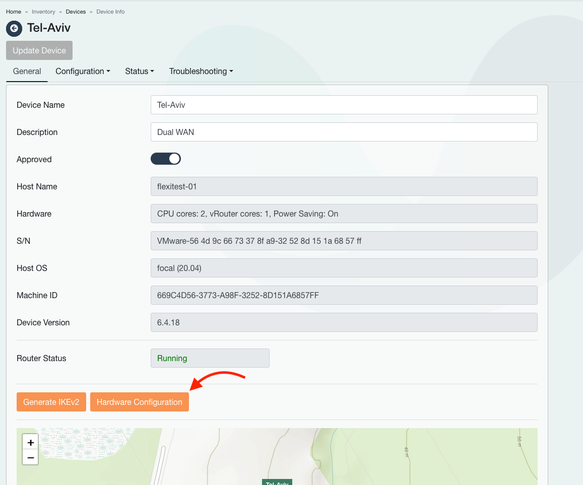 First verify that the device has 3 or more CPU cores, and then prepare it for QoS. To achieve that, navigate to the device settings where QoS will be enabled. Click on the Hardware Configuration.