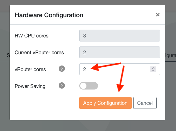 A dialog window will allow configuring vRouter. QoS requires a single CPU core for its operation, configure least 2 CPU cores for vRouter and click apply, after which the device will reboot.