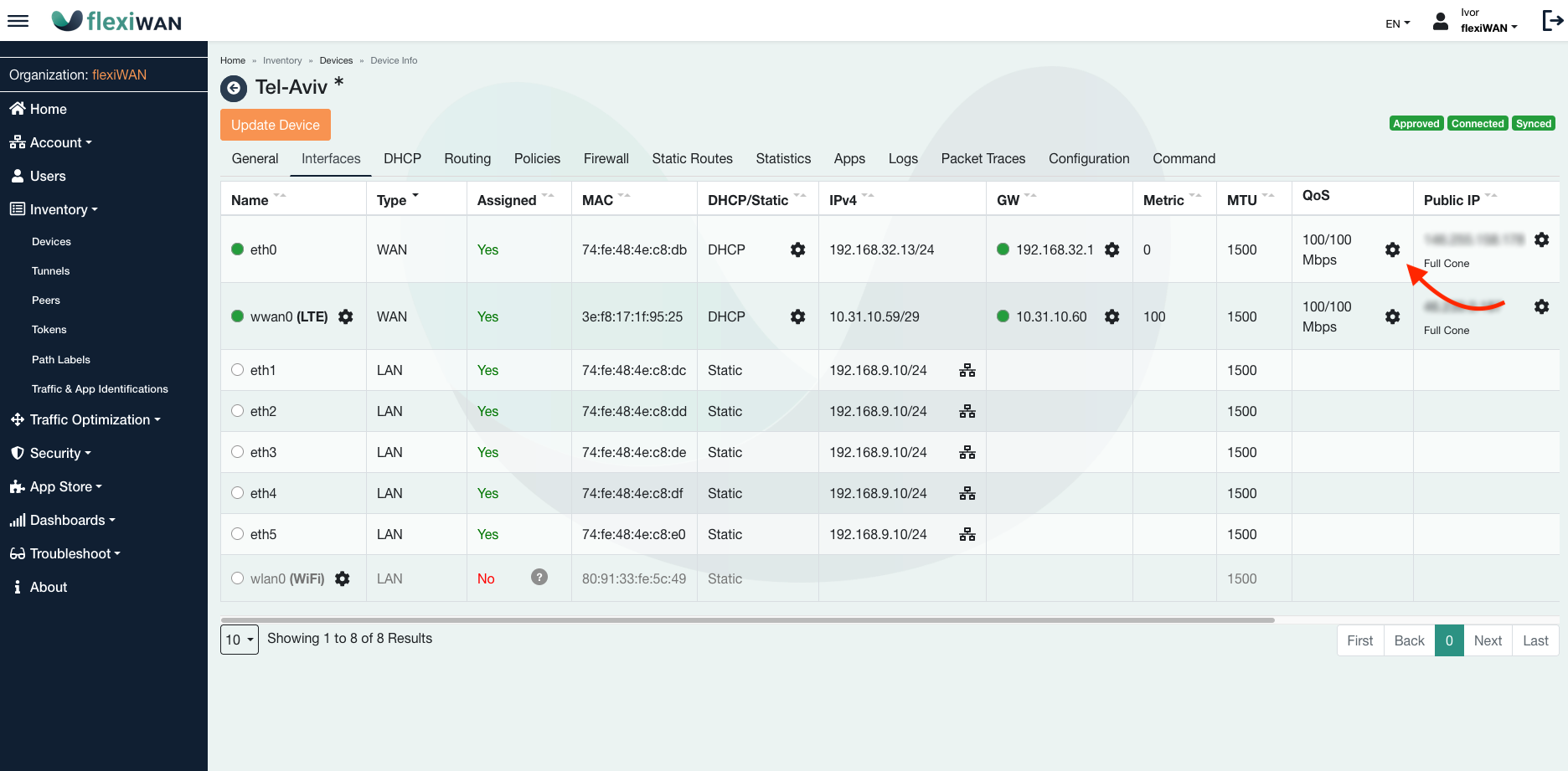 QoS policy is used with multiple WAN interfaces, allowing each WAN interface to have its own QoS policy. If there are multiple WAN interfaces present, repeat the process to set a different QoS policy for each. After configuring the throughput click “Update device” to make sure configuration changes are set.