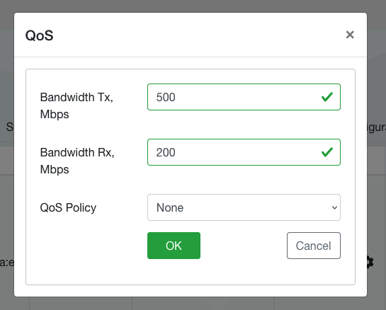 To modify values and match the provided speeds from your ISP or upstream, click on settings icon with the QoS column for specific interface. Represented values are for Bandwidth Tx, used for upload and Bandwidth Rx used for download traffic. Set each to match the ISP throughput / speeds.