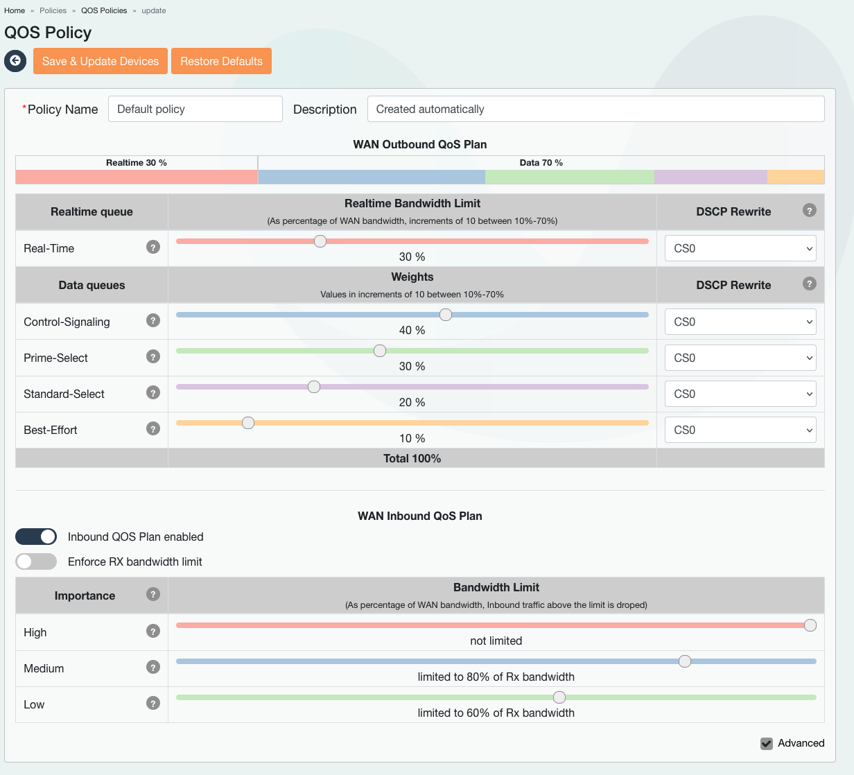 Verify or edit the percentages in each of queue for WAN QoS Plan. Recommended practice is to keep the defaults and change in case modifications are required. Optionally, click on Advanced to set DSCP tags if required.