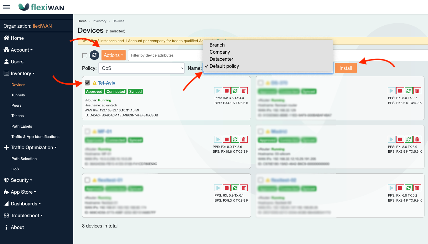 After creating or editing QoS policy, navigate to the Devices dashboard and select flexiEdge device or multiple devices on which QoS policy will be installed. From there, click on Action button and from its menu select Install policy. Under policy select “Quality of Service” and make sure the “Default policy” is selected. Finally click install to deploy the selected policy on specified flexiEdge site.