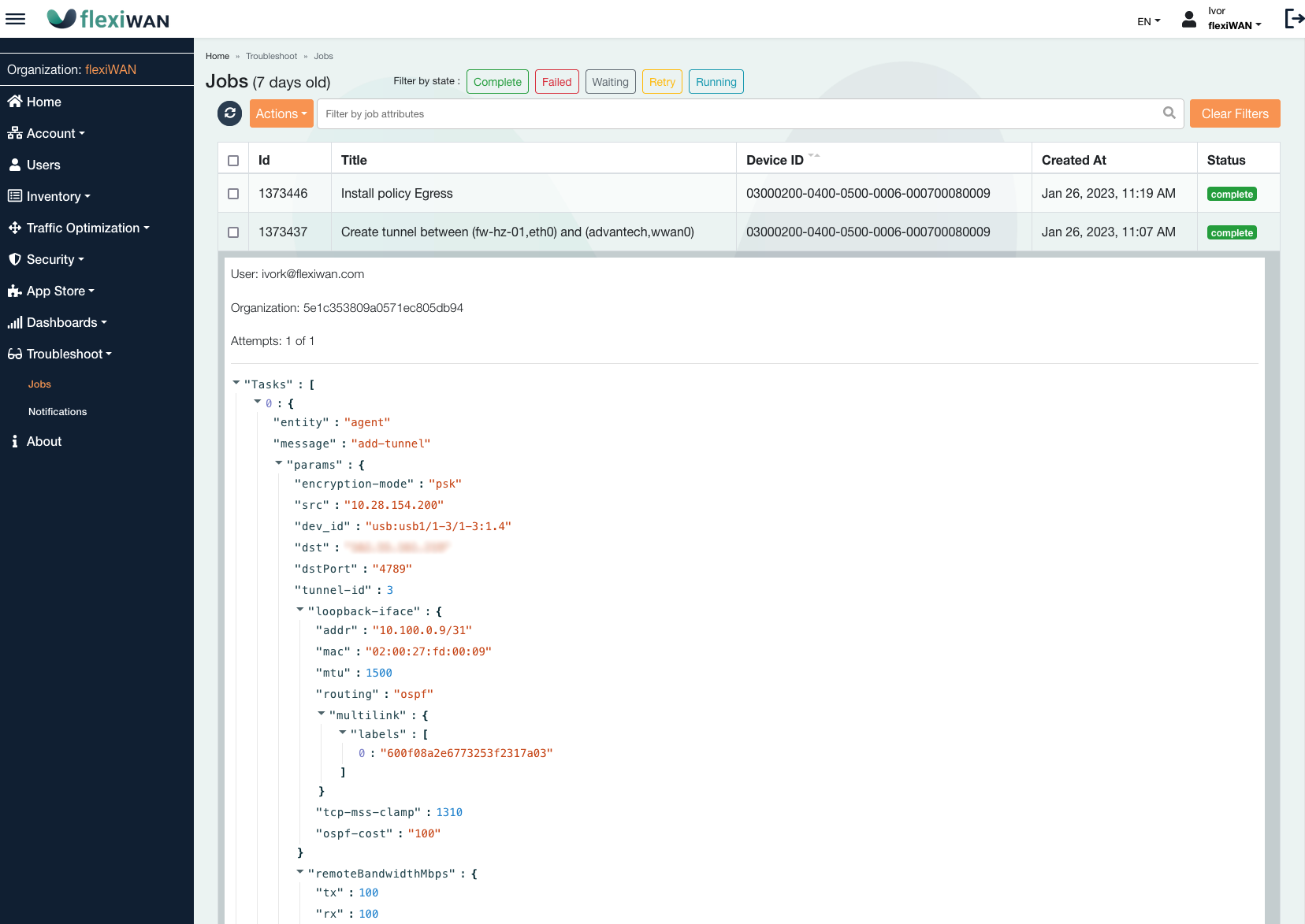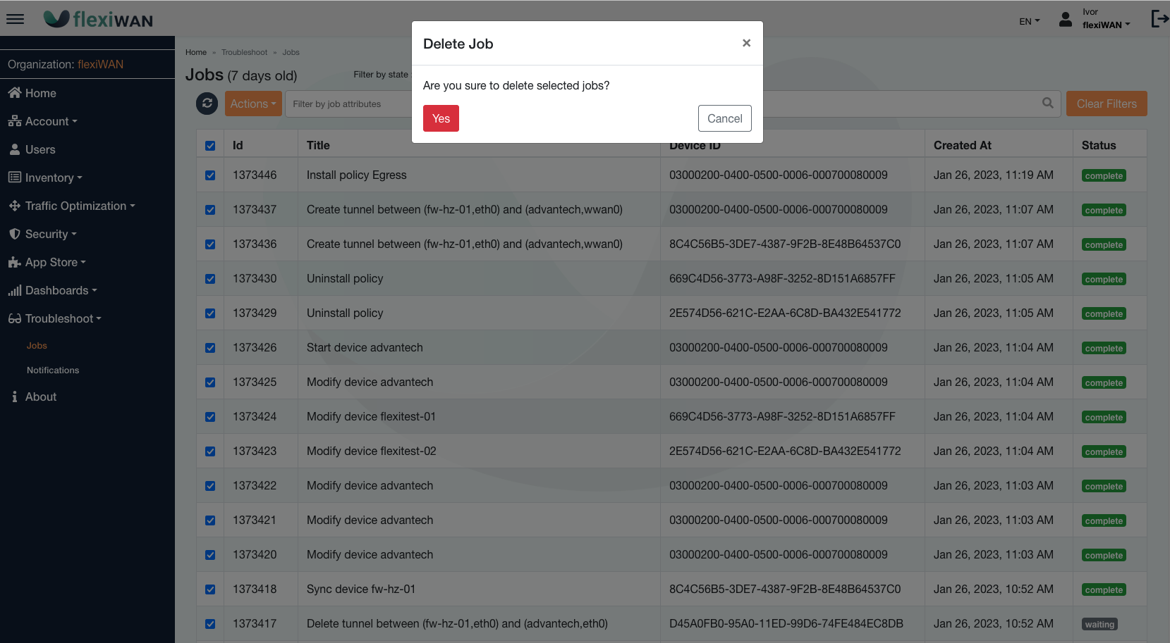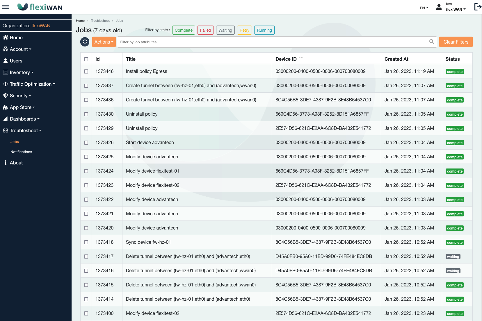 Every device operation is queued as a job, and the job is executed when the device is connected and ready. Jobs and their status can be viewed from the Troubleshoot > Jobs page.