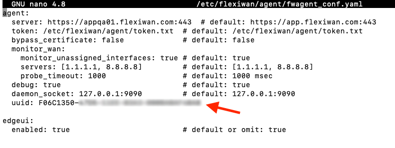 If this situation arises, go to the path /etc/flexiwan/agent/fwagent_conf.yaml and insert a line containing the UUID that corresponds to the UUID of the device registered in flexiManage. You can locate the UUID under the General tab within the device settings.