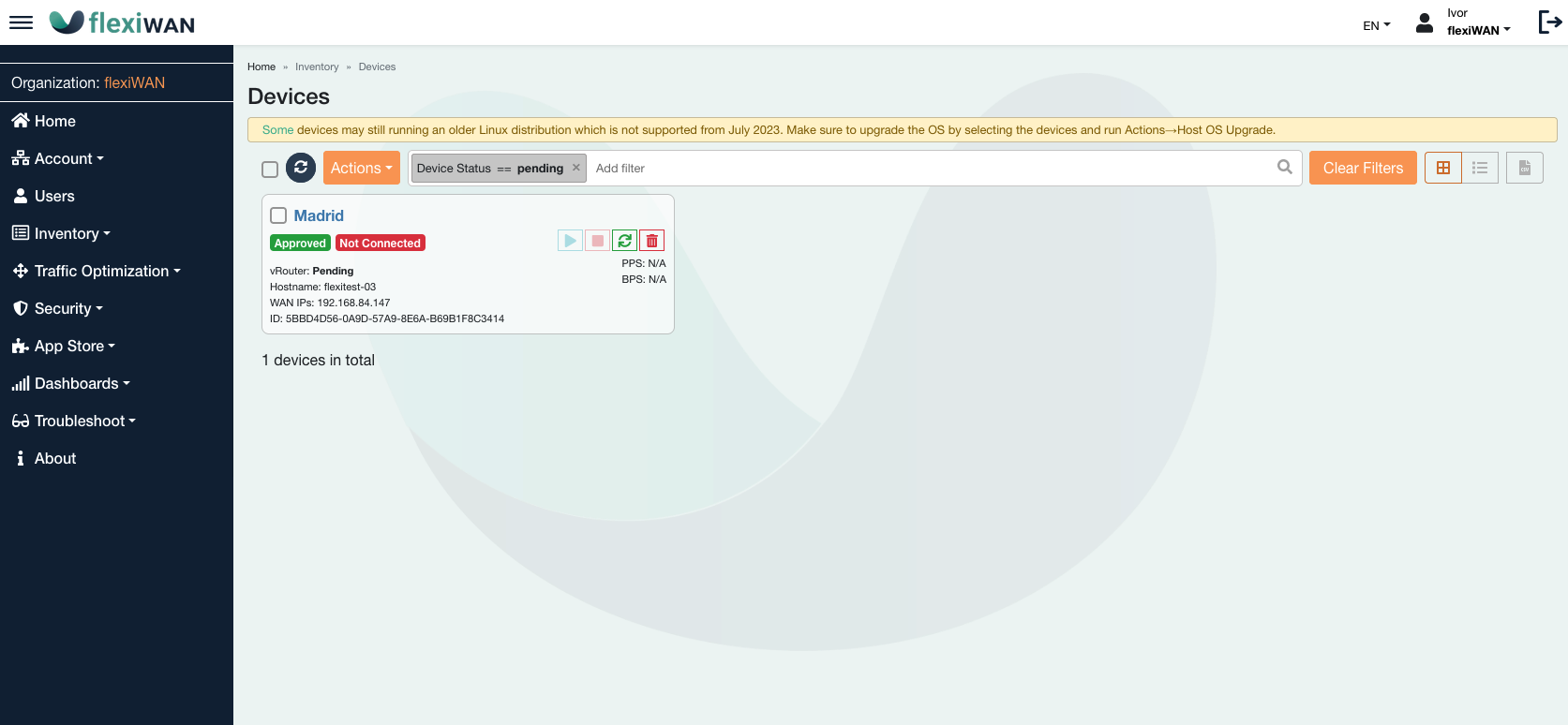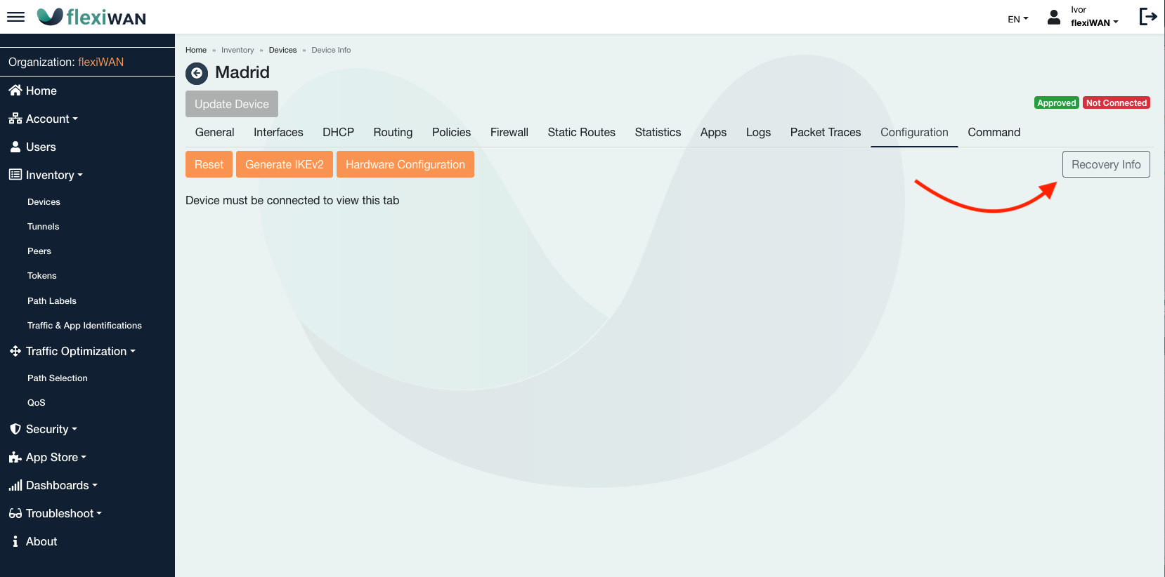 While it’s normal for a device to occasionally disconnect from flexiManage due to internet problems, sometimes the device’s software prevents flexiWAN from running. In such cases, you’ll need to perform a recovery to bring back the device’s settings from flexiManage to the newly recovered device.