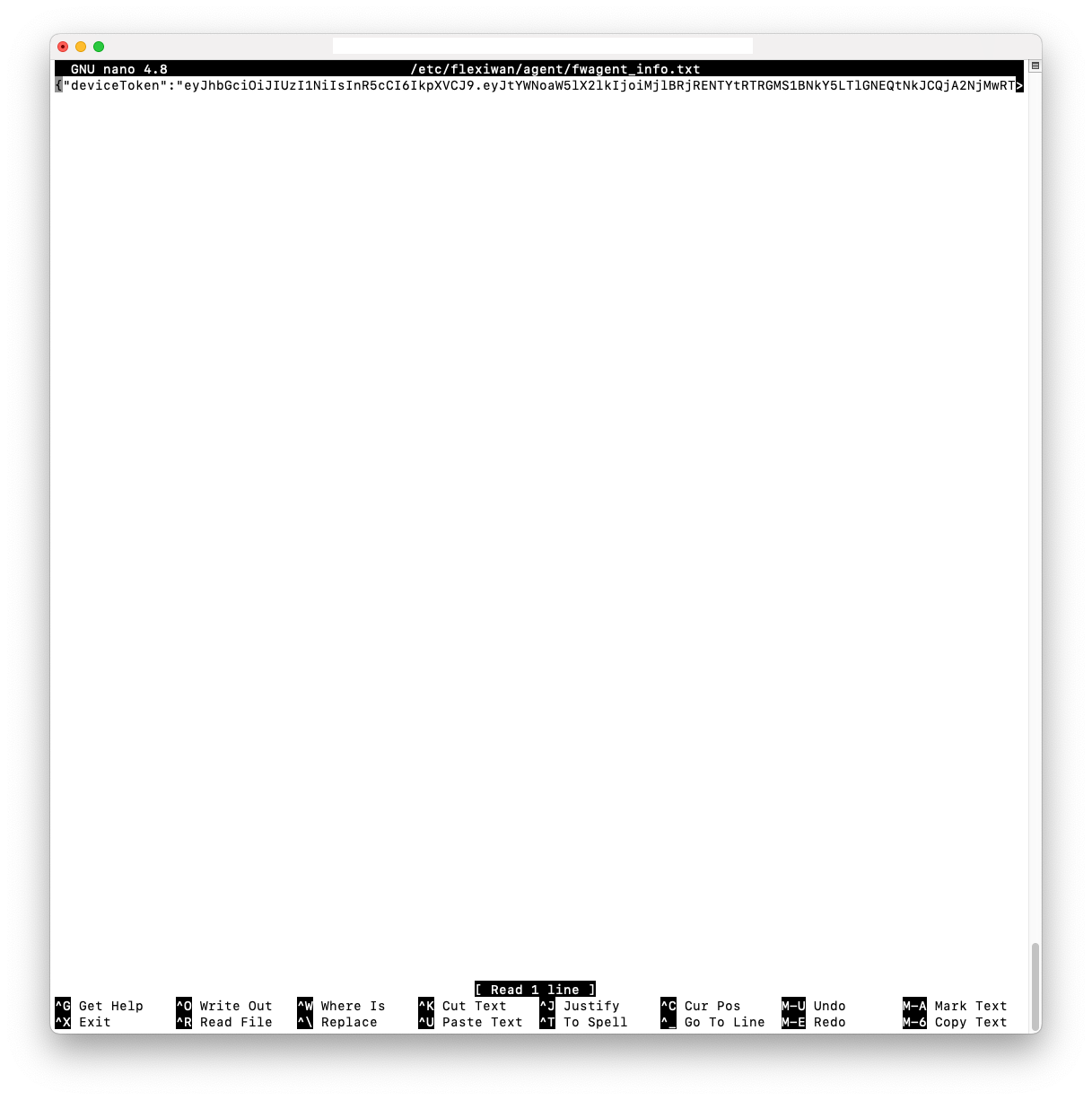 Next switch to the device serial console or ssh and open /etc/flexiwan/agent/fwagent_info.txt using vi or nano and paste the token copied from the previous section.