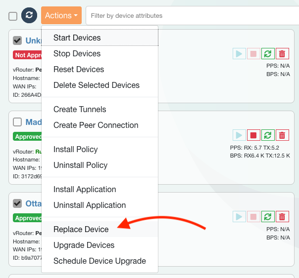 Following the usual flexiManage flow, click on the Actions button and from it click on Replace Device.